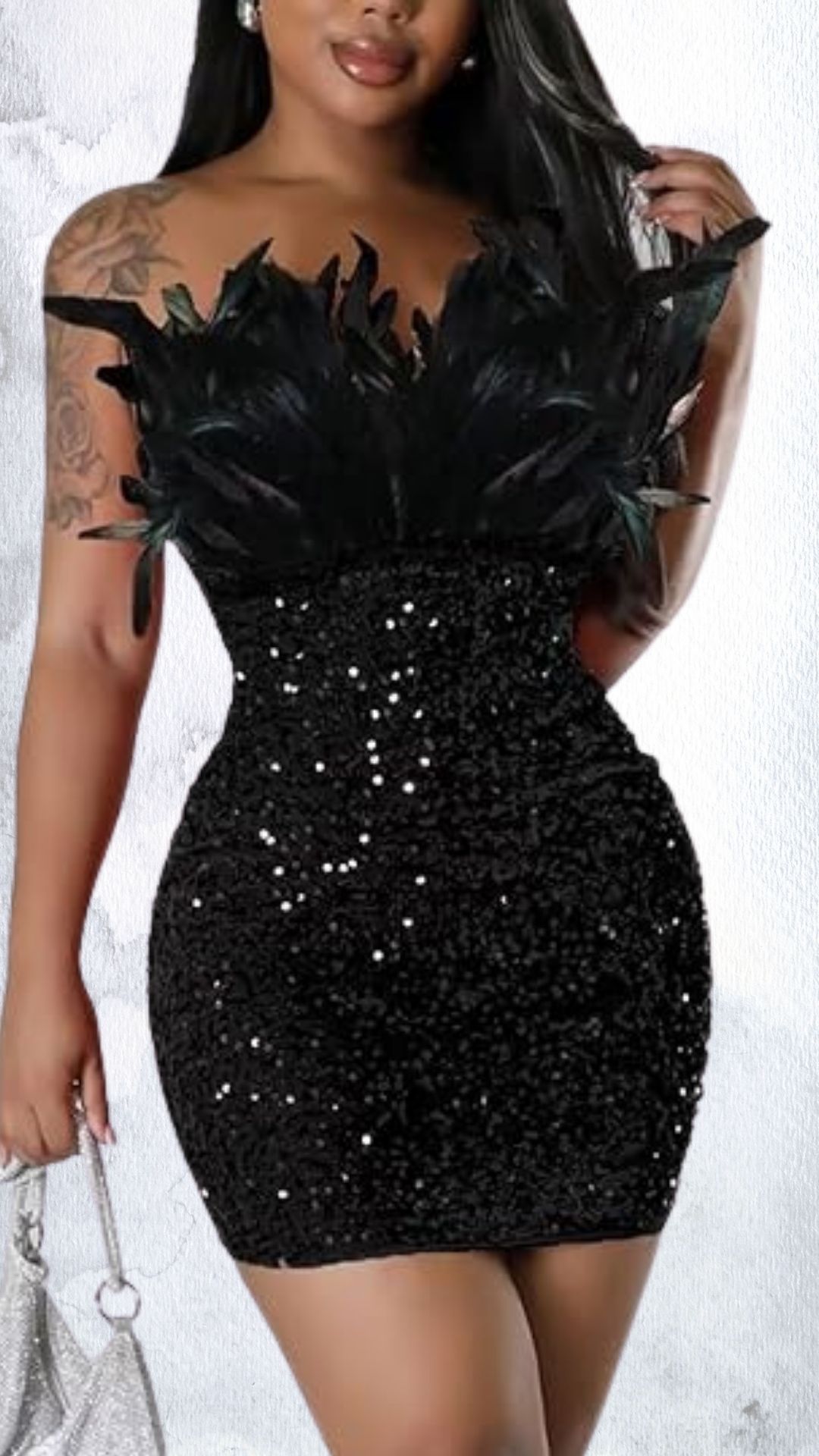 Additionally, the playful feather detailing at the hemline introduces a fun, flirty element that sets this dress apart.
