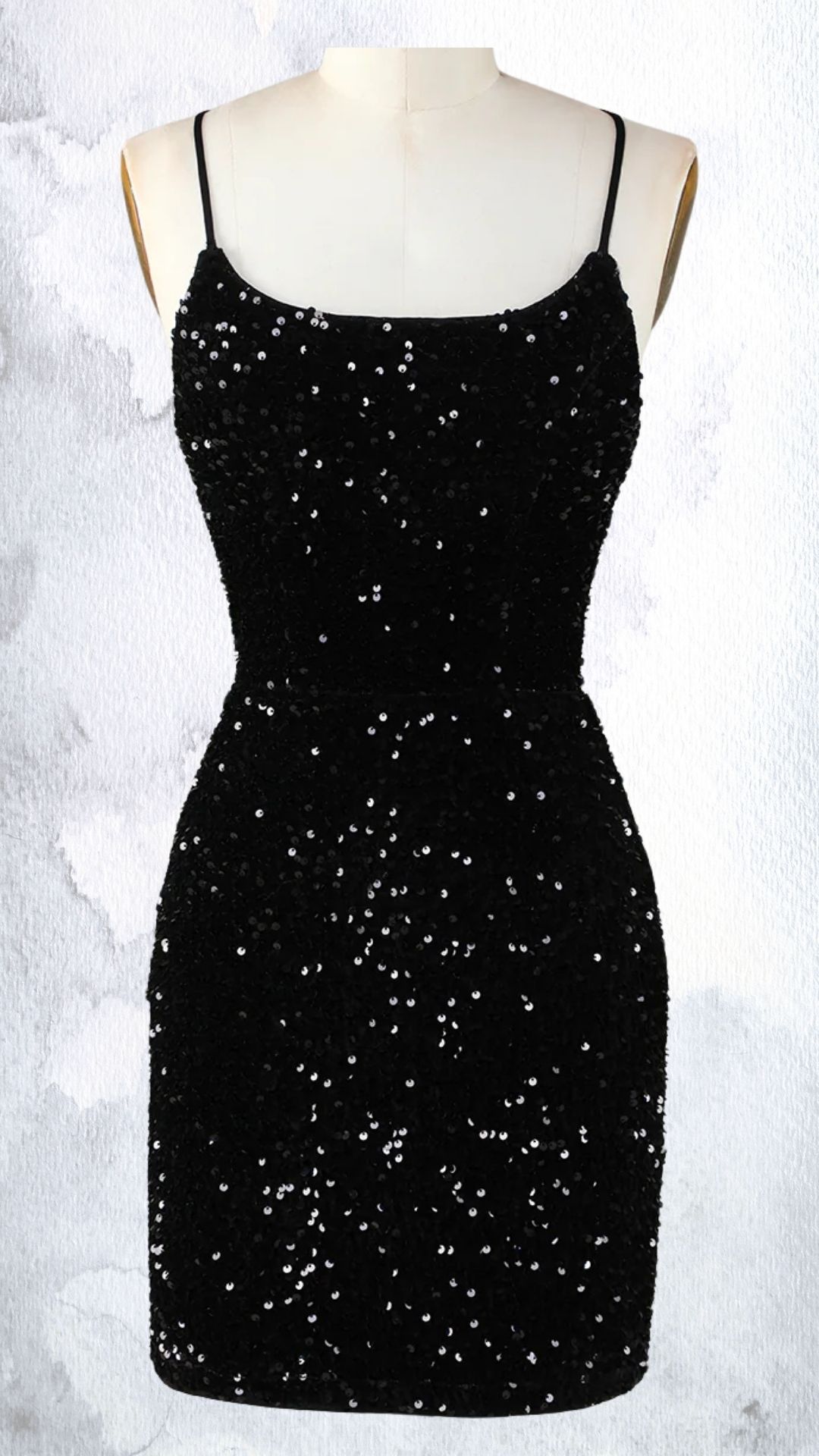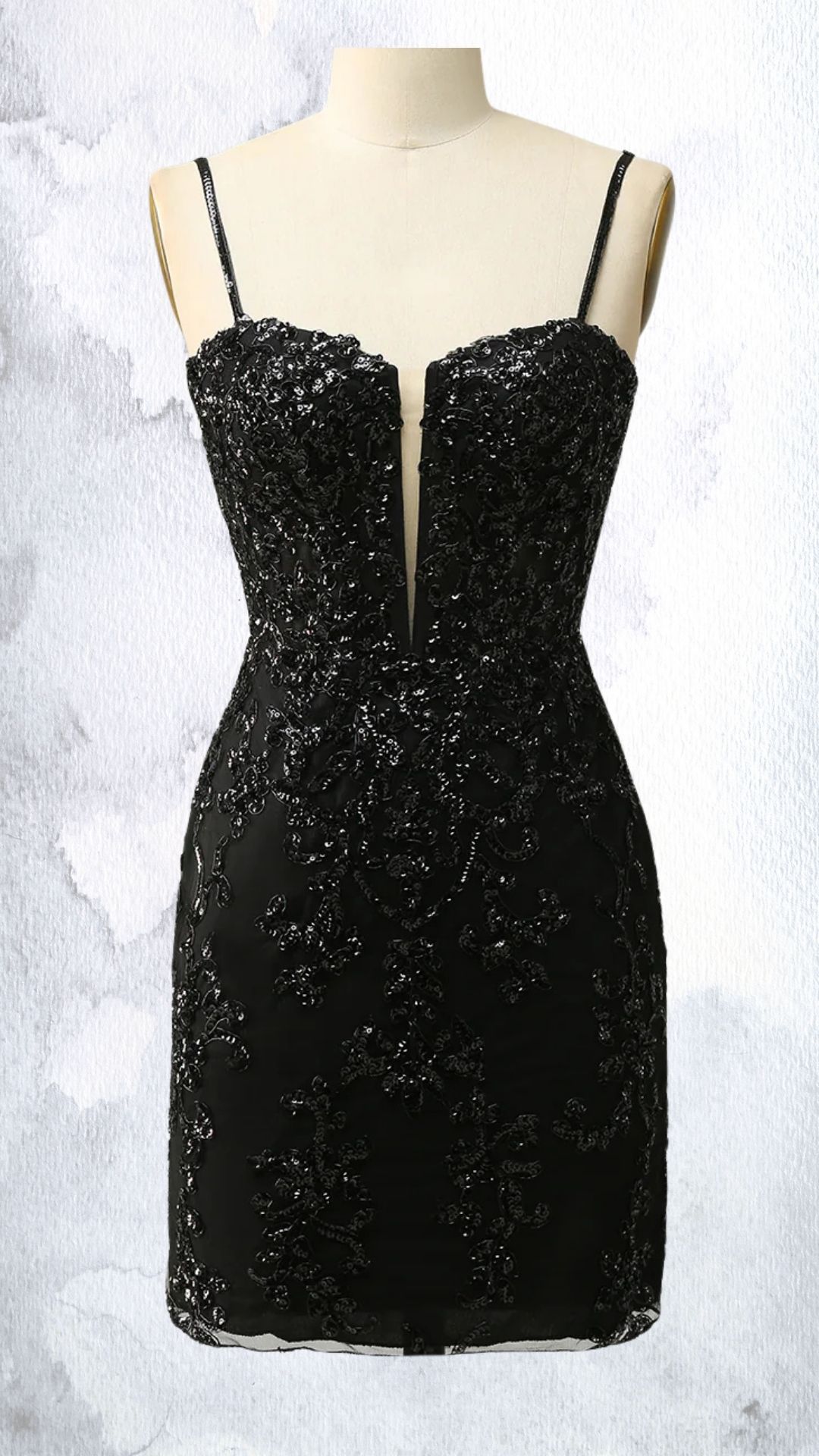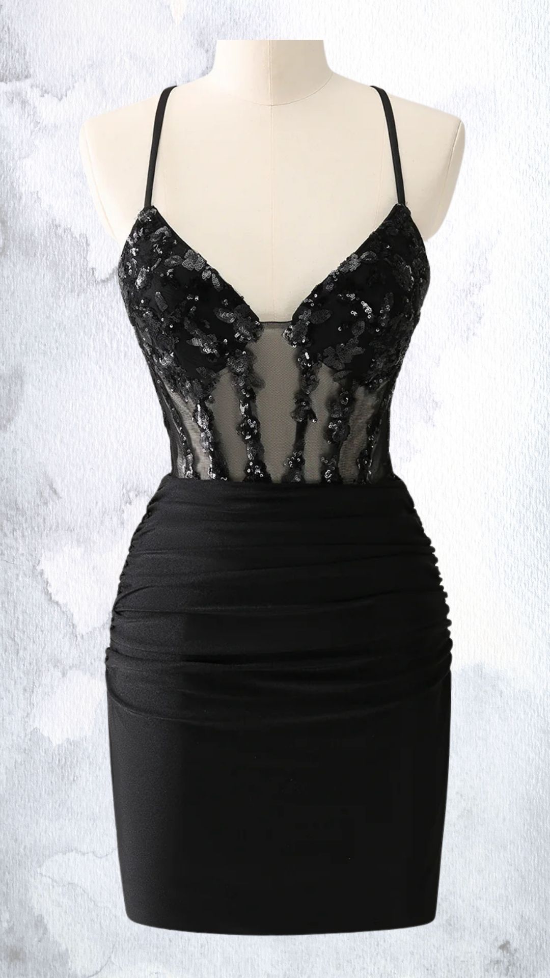 This stunning short black dress is designed to captivate with its fitted silhouette, featuring a daring deep V-neckline and delicate spaghetti straps. The combination of smooth mesh and densely packed black sequins creates a striking visual texture, enhanced by intricate reflective beads and cutouts that embellish the bodice.