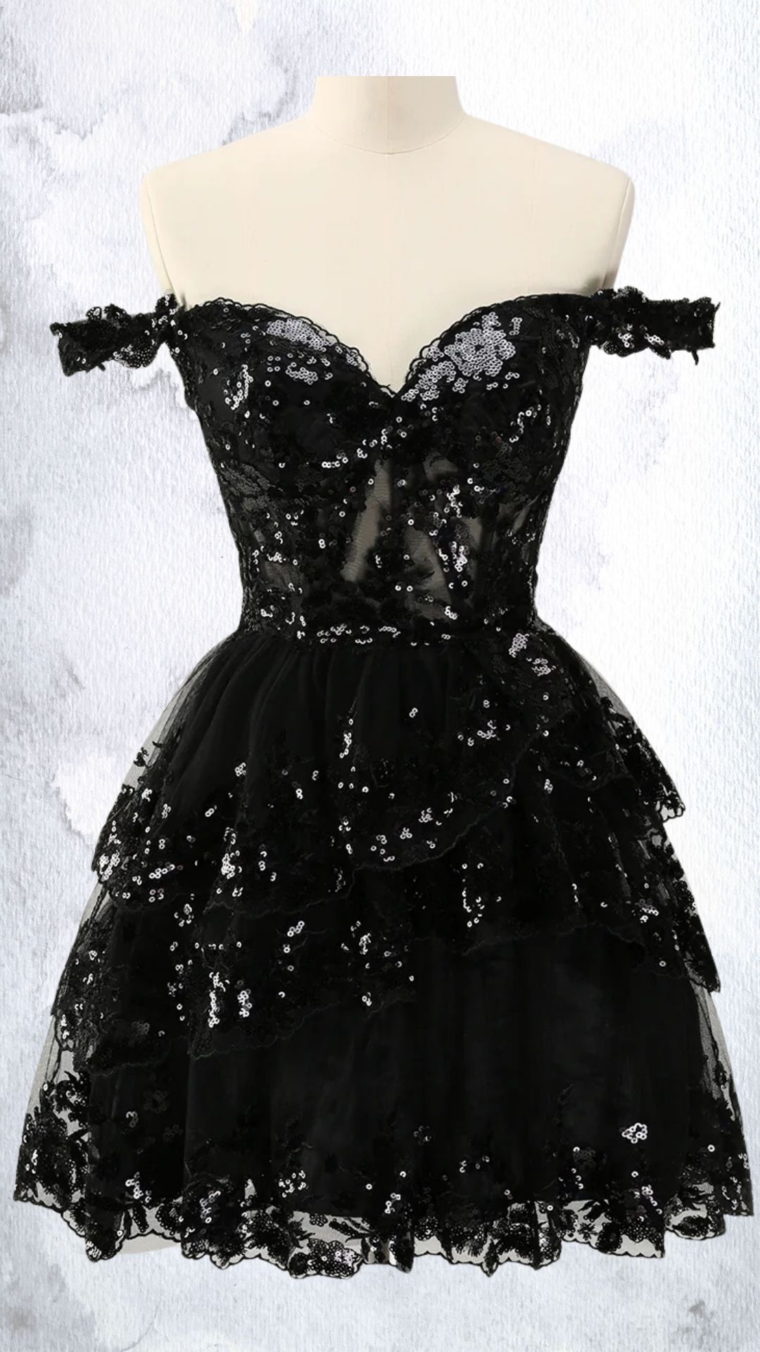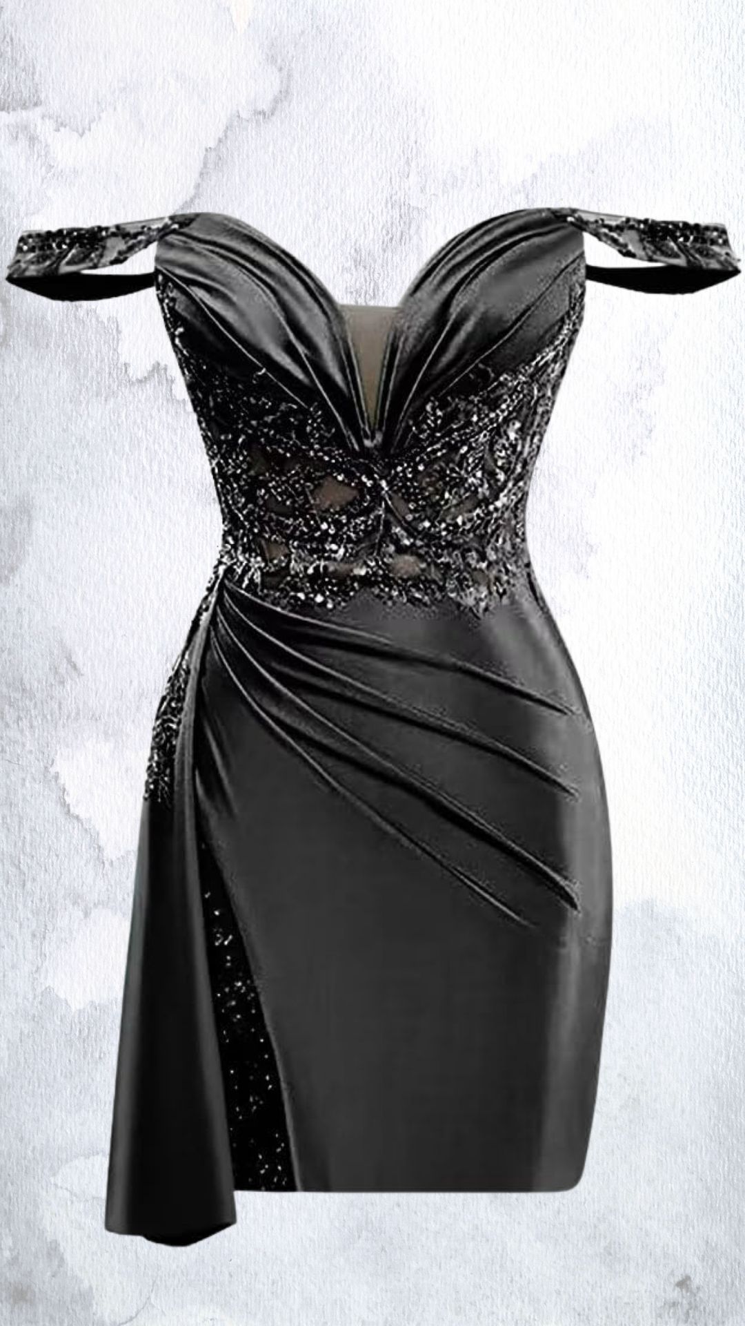 This stunning black mini dress features a charming off-the-shoulder silhouette accentuated by a sweetheart neckline. The exquisite embellishments of sequins and beads create a captivating shimmer, ensuring you stand out at any special occasion.