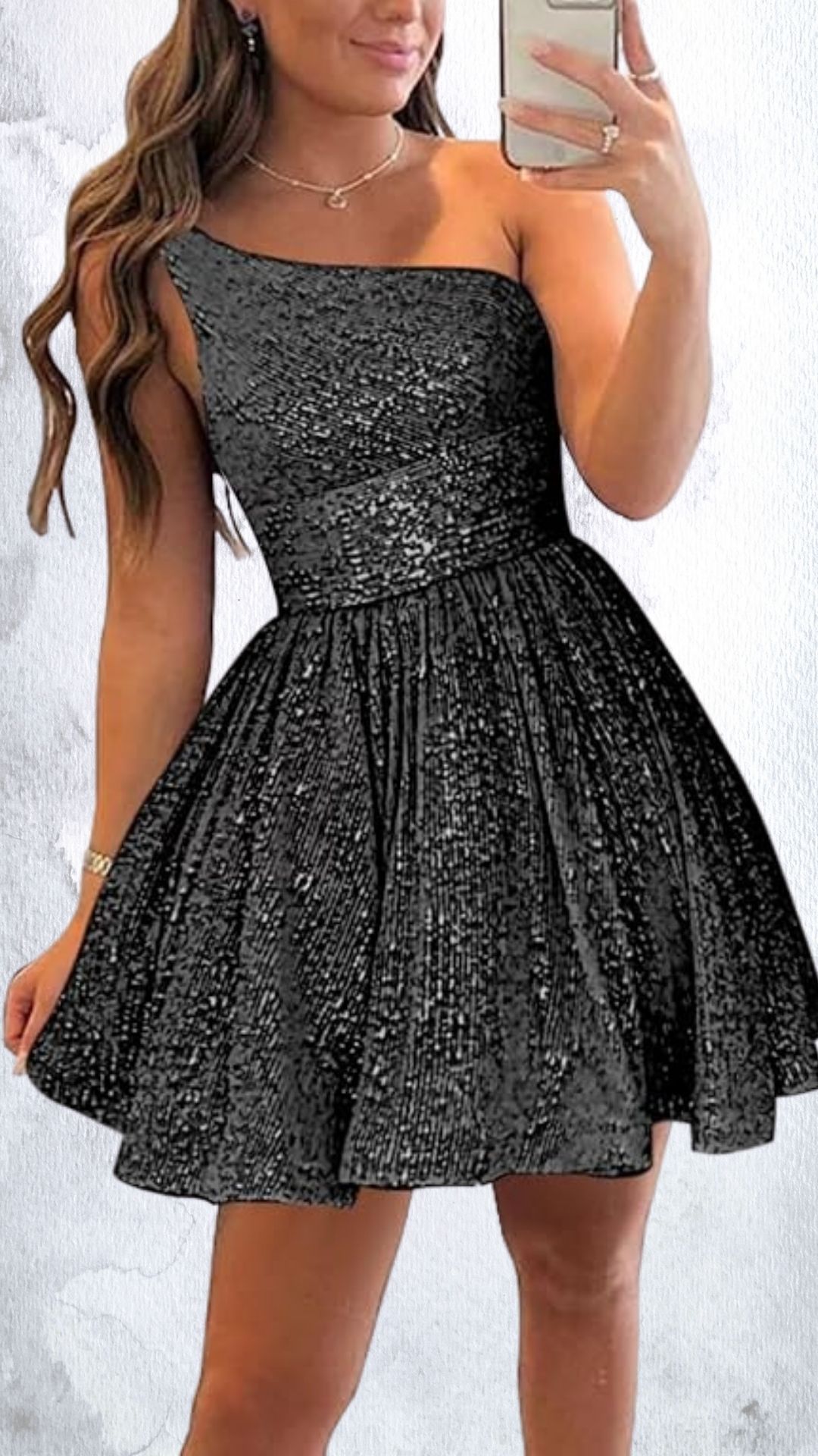 This black mini dress is a chic statement piece that embraces both elegance and fun. The flattering A-line silhouette is enhanced by shimmering sequins, adding a vibrant sparkle with every movement. Its one-shoulder design perfectly highlights the fitted bodice, while the flared skirt balances youthful charm with sophistication.
