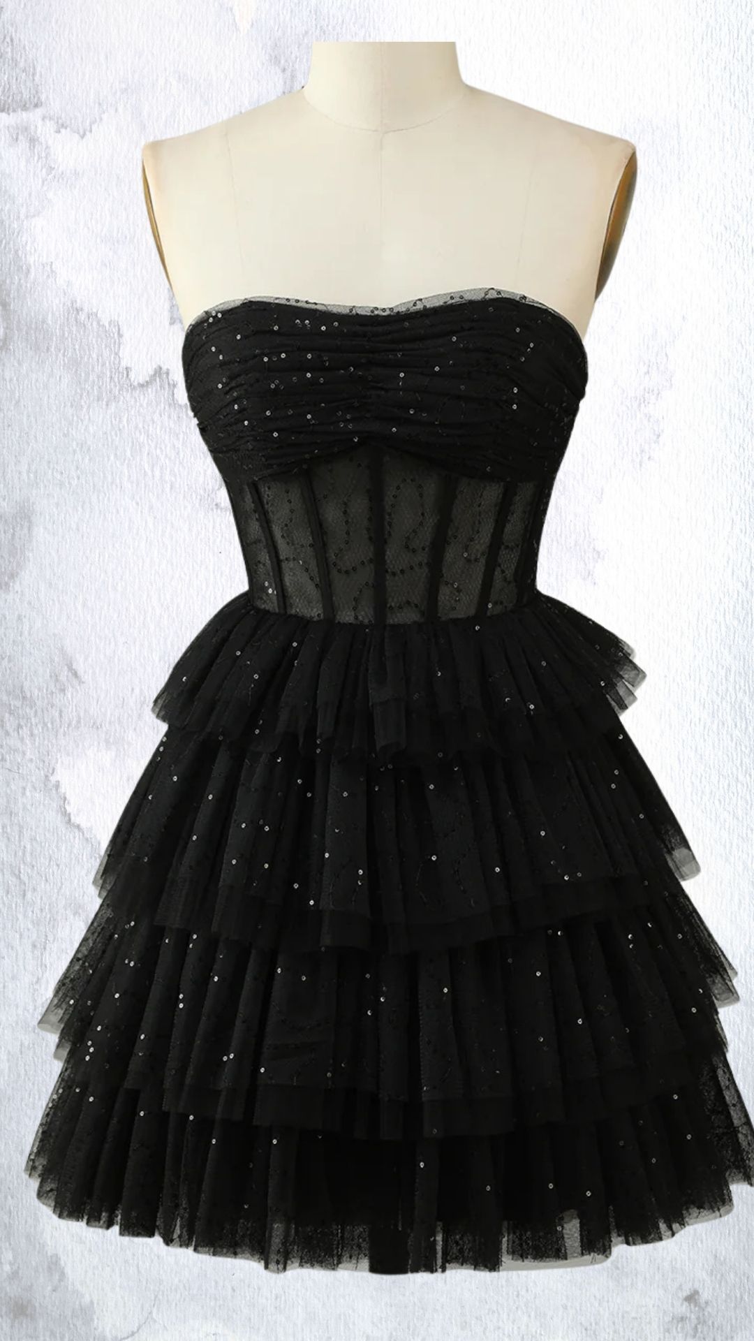 This stunning black mini dress perfectly balances elegance and whimsy.