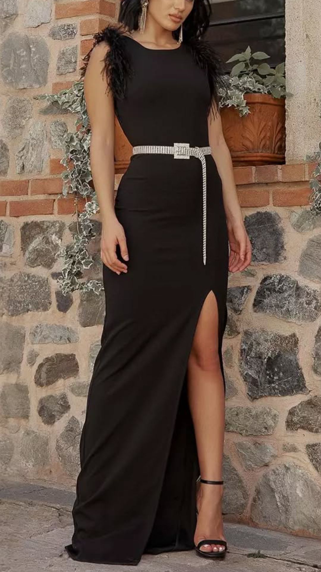 The feather embellishments on the shoulders add an eye-catching detail, while the thigh-high slit introduces a playful hint of flirtation.