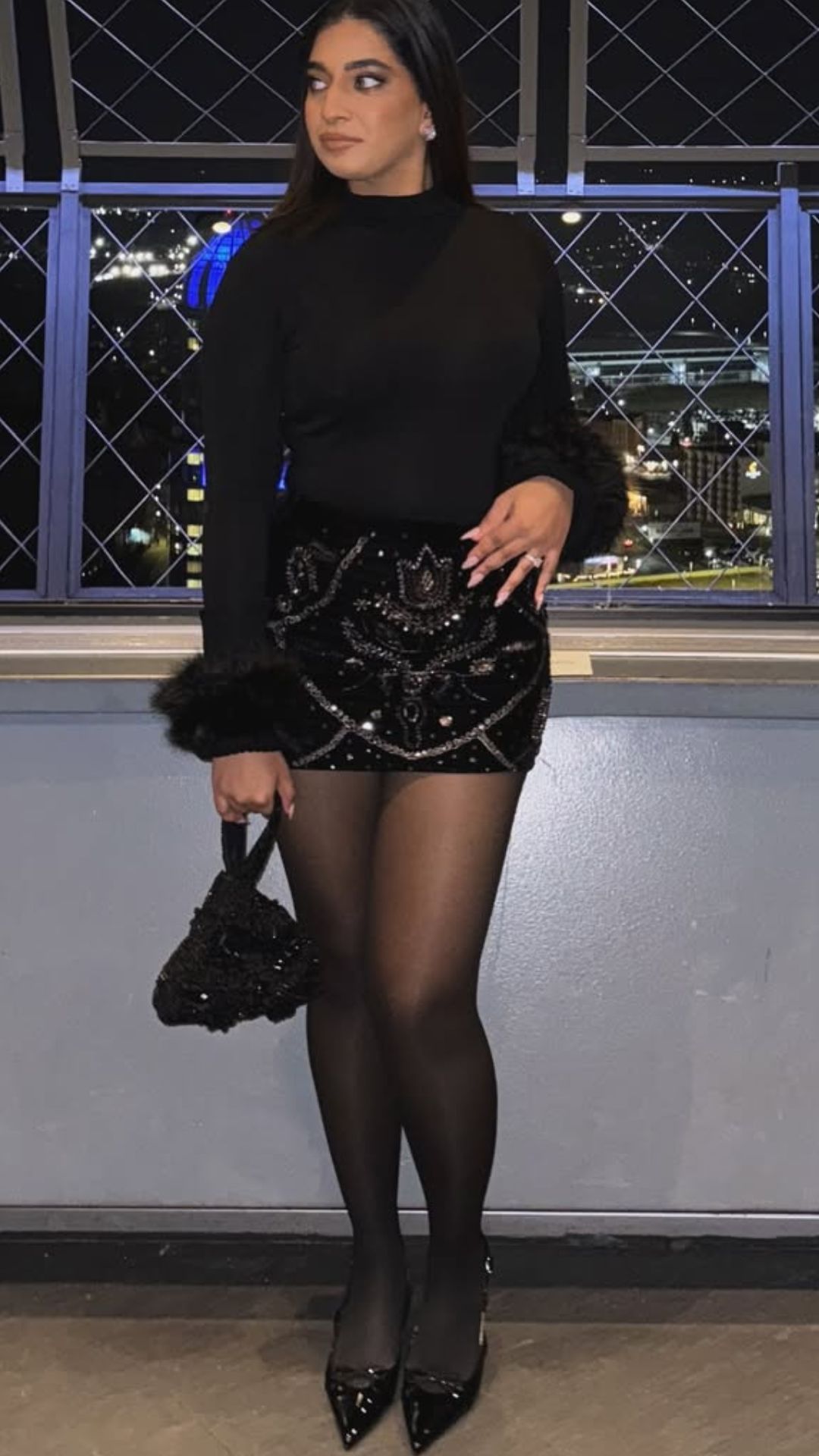 The black mini skirt, embellished with intricate beadwork, adds just the right amount of flirtiness, catching the light with every movement.