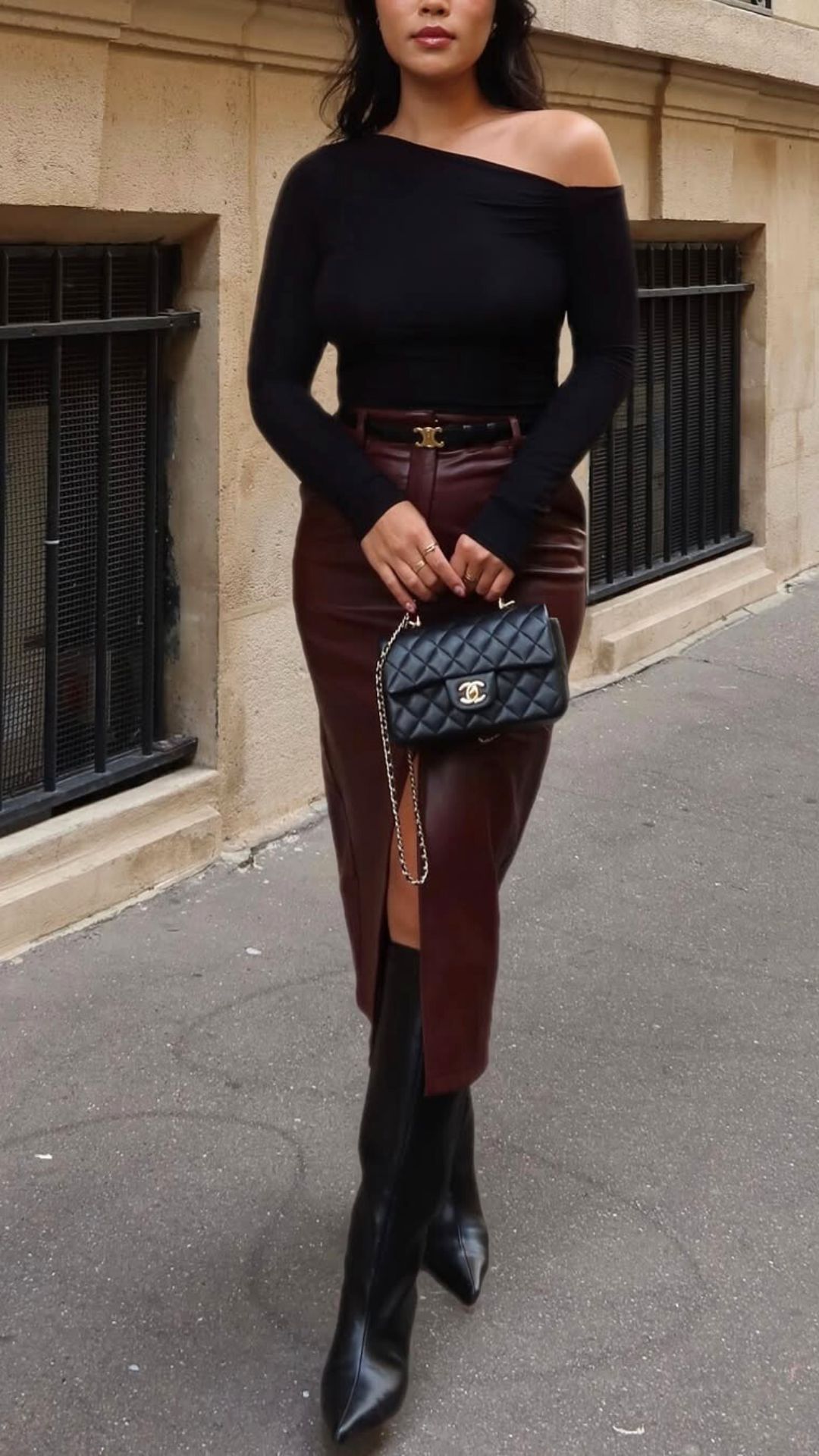 This sophisticated ensemble features a fitted black off-the-shoulder top that highlights the shoulders, paired with a high-waisted burgundy faux leather pencil skirt, creating a figure-flattering silhouette.