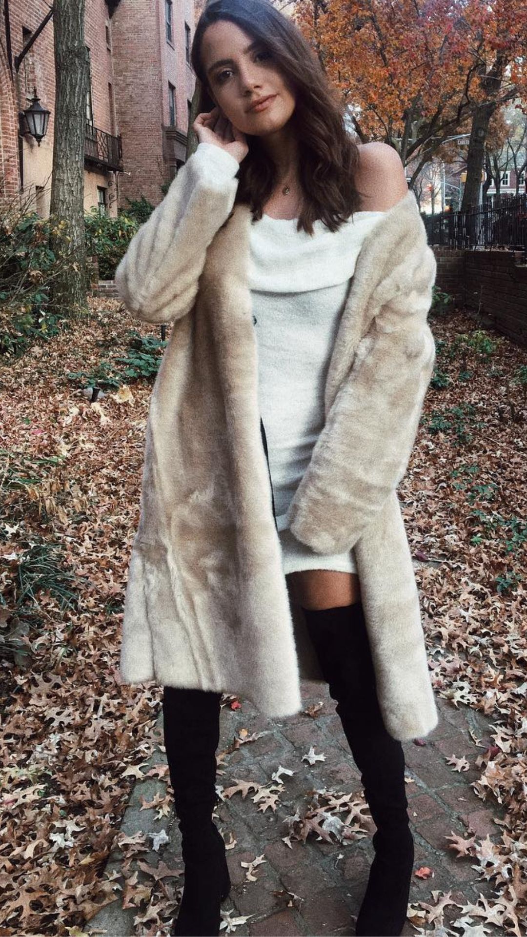 The form-fitting, off-the-shoulder light grey dress creates an alluring silhouette, while the plush beige faux fur coat adds a touch of luxe warmth.