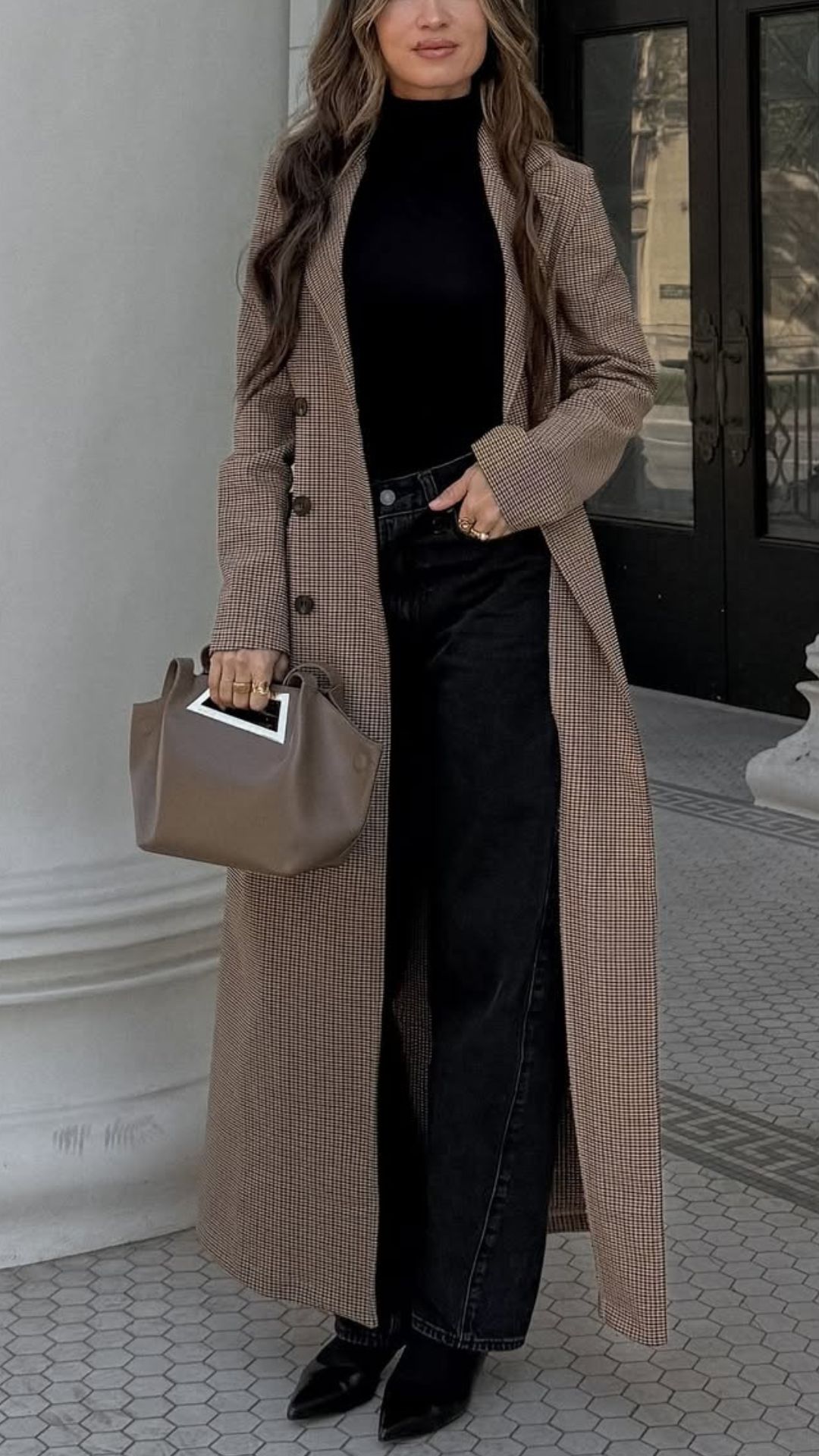 This chic winter outfit effortlessly combines warmth and elegance, making it ideal for a romantic evening out. The long, houndstooth-patterned coat in rich brown tones drapes gracefully, adding a touch of sophistication.