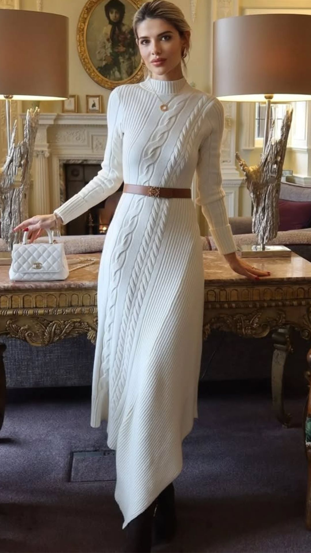 This sophisticated outfit combines a form-fitting, ribbed white sweater dress with intricate cable-knit details, perfect for creating a warm and romantic vibe.
