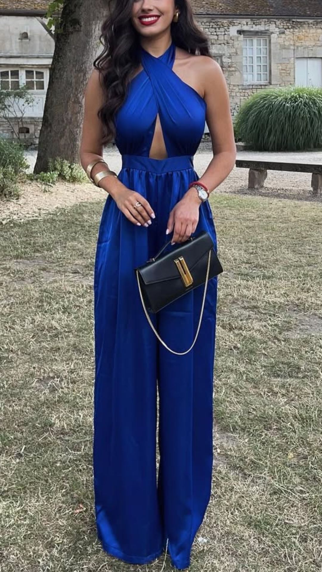 The royal blue jumpsuit showcases a dazzling sheen that catches the light beautifully, making it a standout piece for winter evenings.