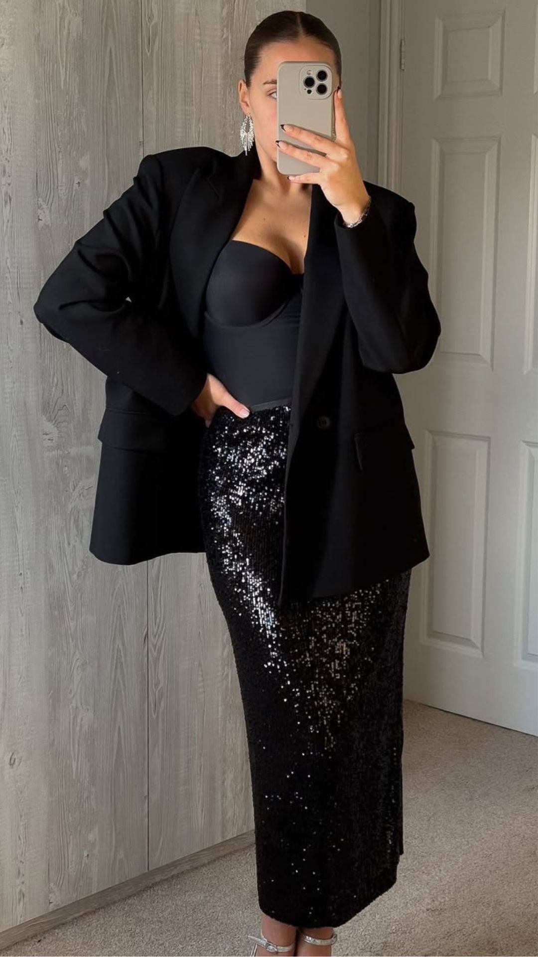 This stunning outfit combines a fitted black mini dress with a shimmering black sequin blazer for a chic, romantic look.
