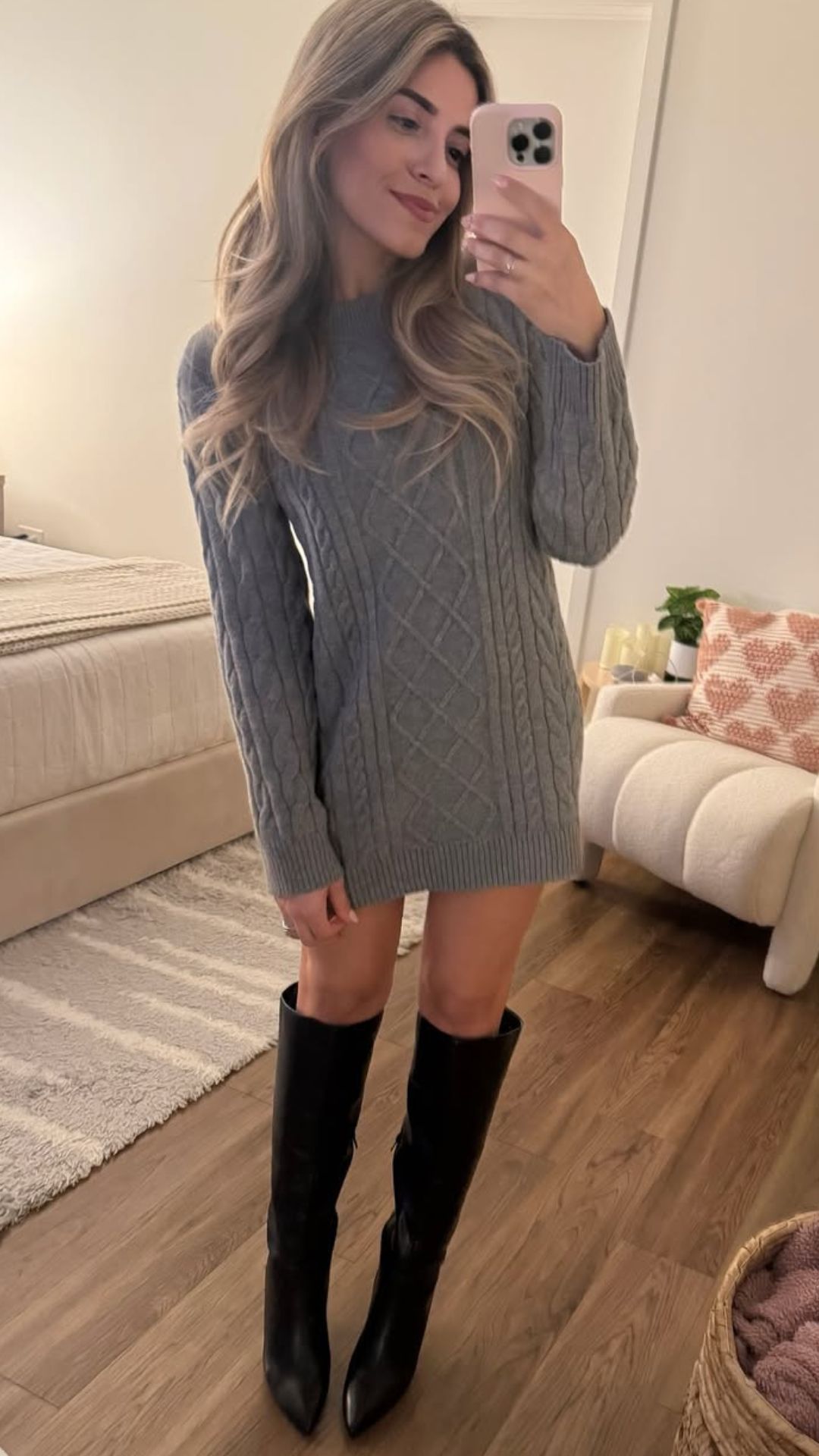 This chic ensemble showcases a mid-thigh light gray cable-knit sweater dress, radiating warmth while maintaining a chic allure.