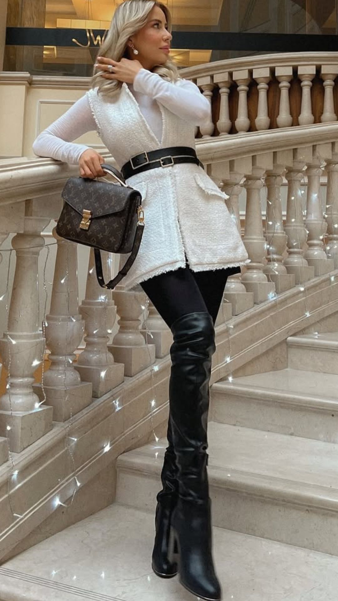 Paired with a chic quilted white handbag, this ensemble strikes the ideal balance between elegance and flirtation, ensuring you look effortlessly stylish on a winter date night.