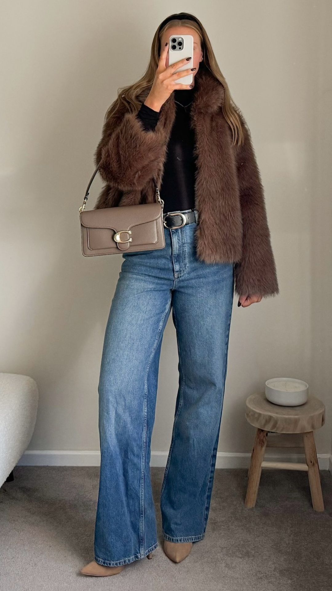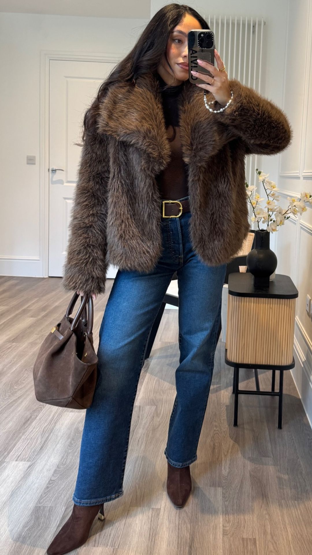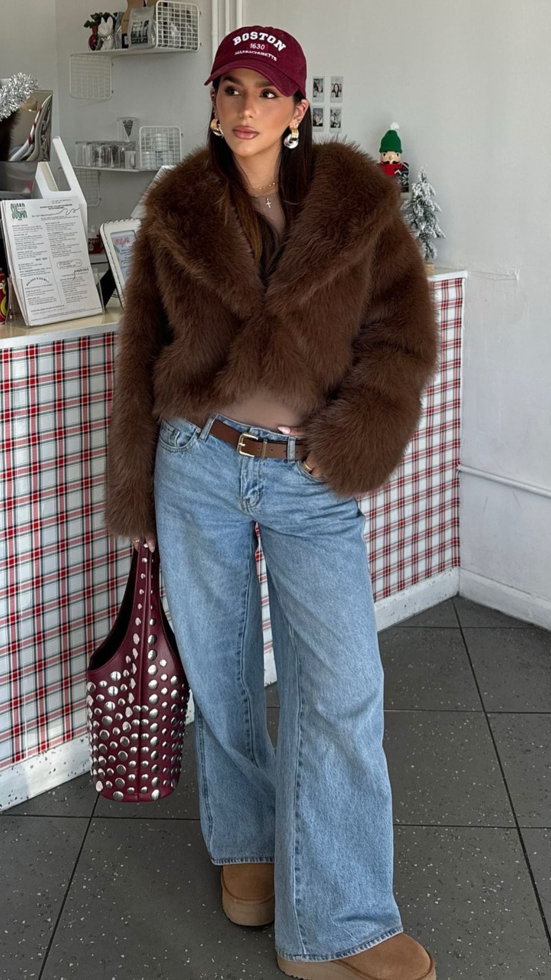 This outfit showcases a cozy, cropped brown faux fur jacket that radiates warmth and texture. The relaxed-fit, light-wash denim jeans create a casual base that contrasts beautifully with the luxe jacket.