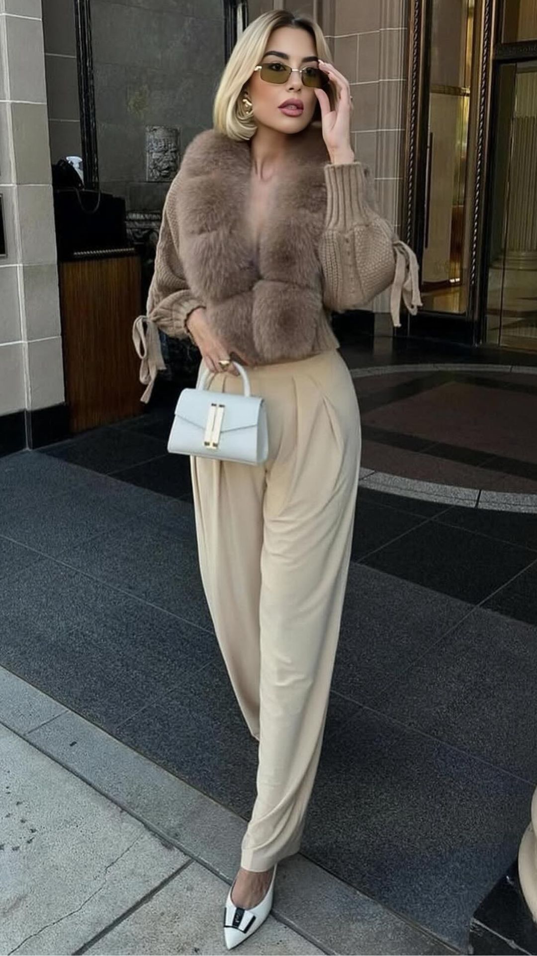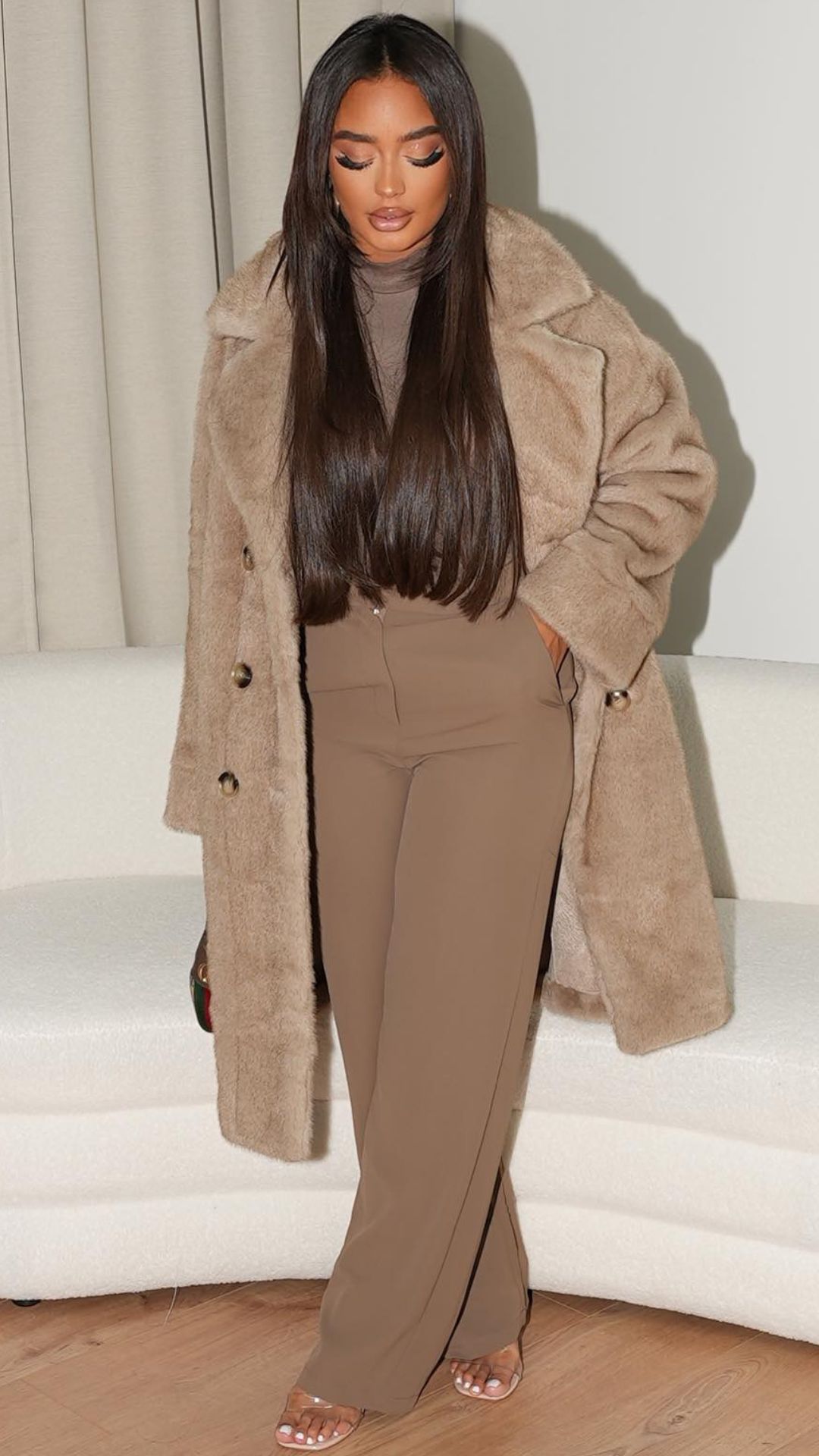The luxurious texture of the coat complements the high-waisted brown trousers, which accentuate the figure while providing comfort.