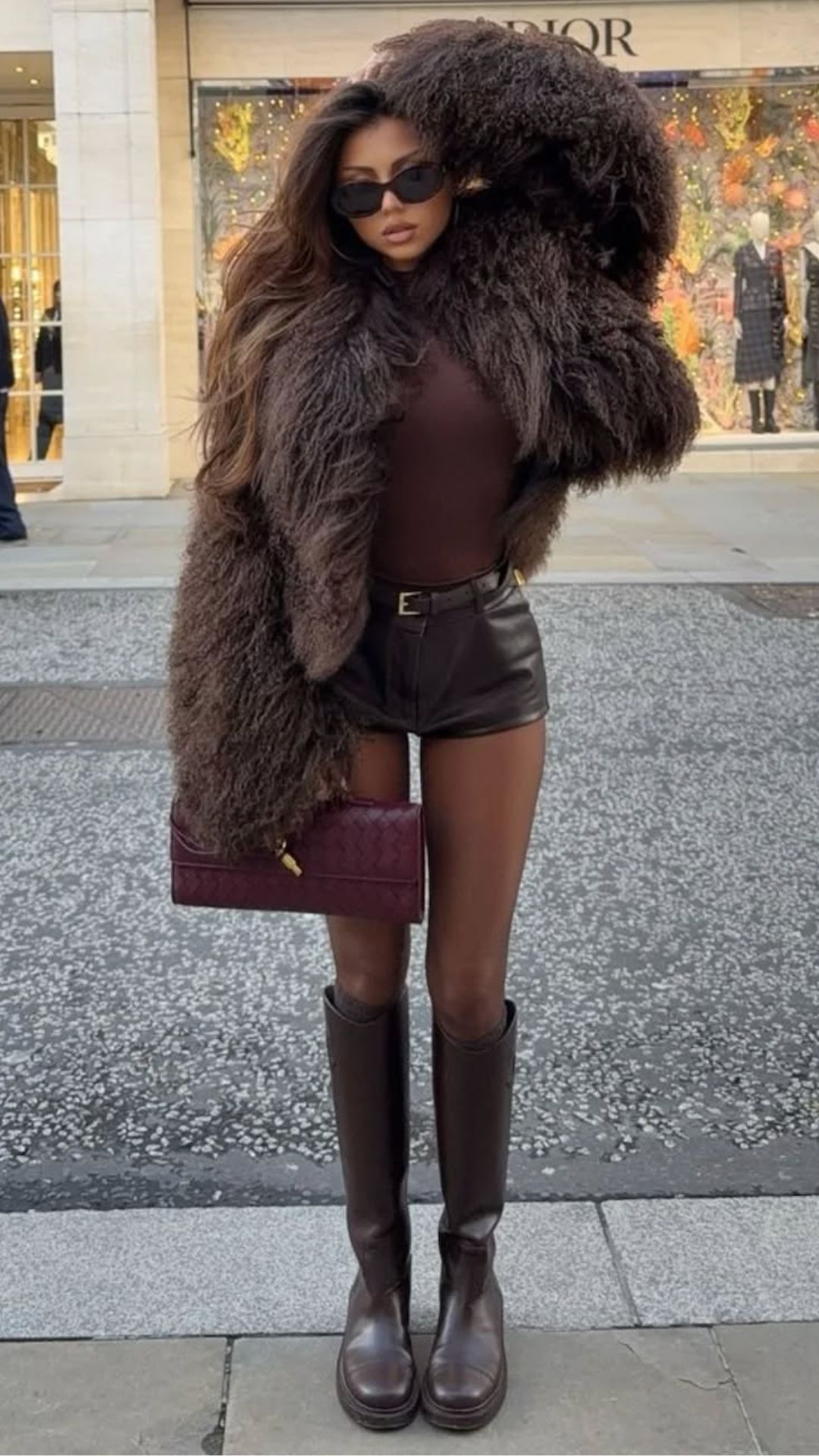 This exquisite winter outfit showcases a rich, deep brown faux fur jacket that radiates elegance with its oversized collar and plush texture.