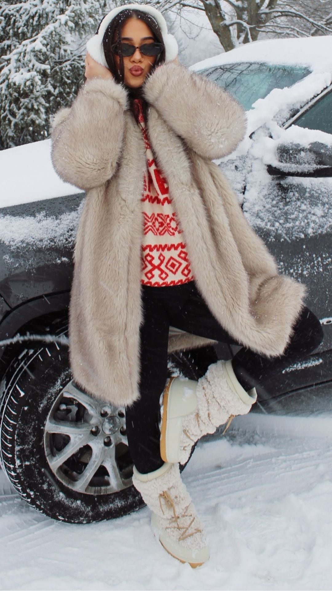 This outfit showcases a cozy faux fur jacket with an irresistibly soft texture, making it a seasonal staple for winter fashion lovers.