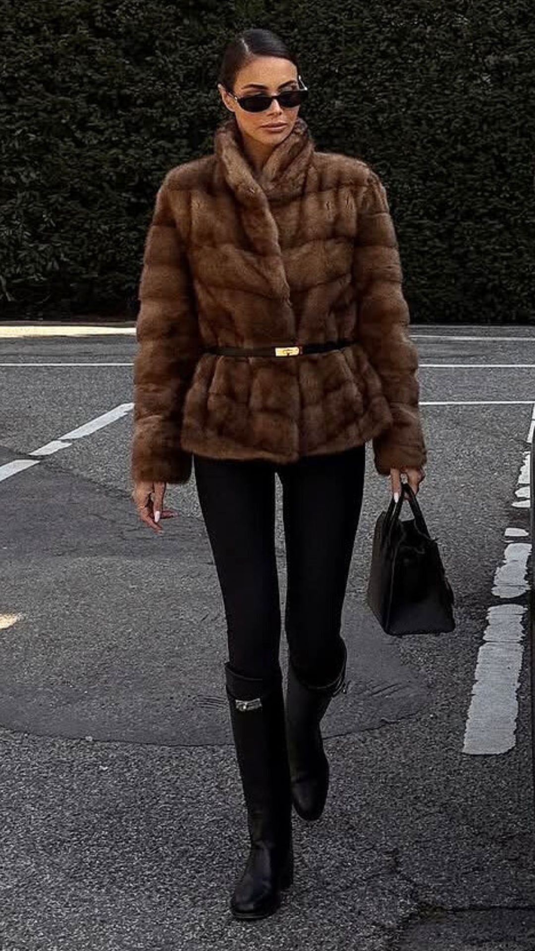This winter outfit showcases a luxurious rich brown faux fur jacket with a striking wide collar, complementing a sleek black fitted top that enhances body shape.