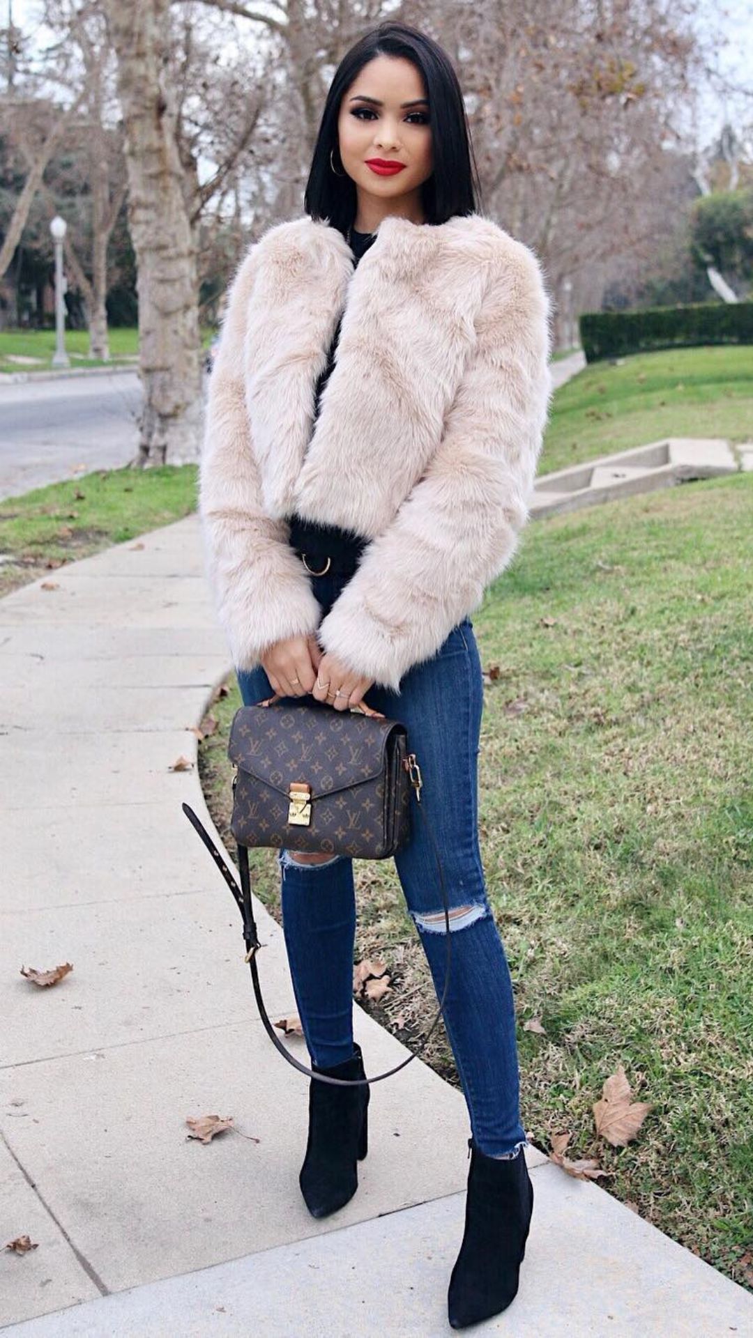 This outfit features a soft beige faux fur jacket that adds a luxurious touch to your winter wardrobe.