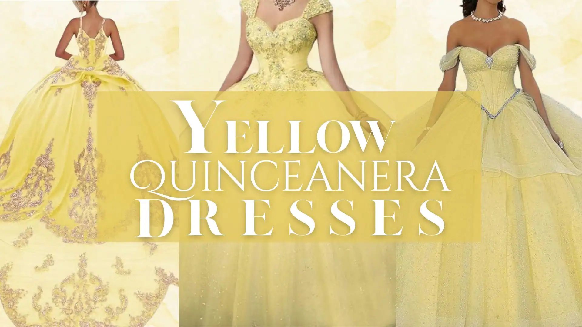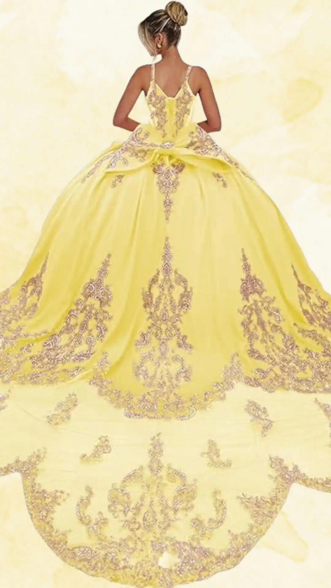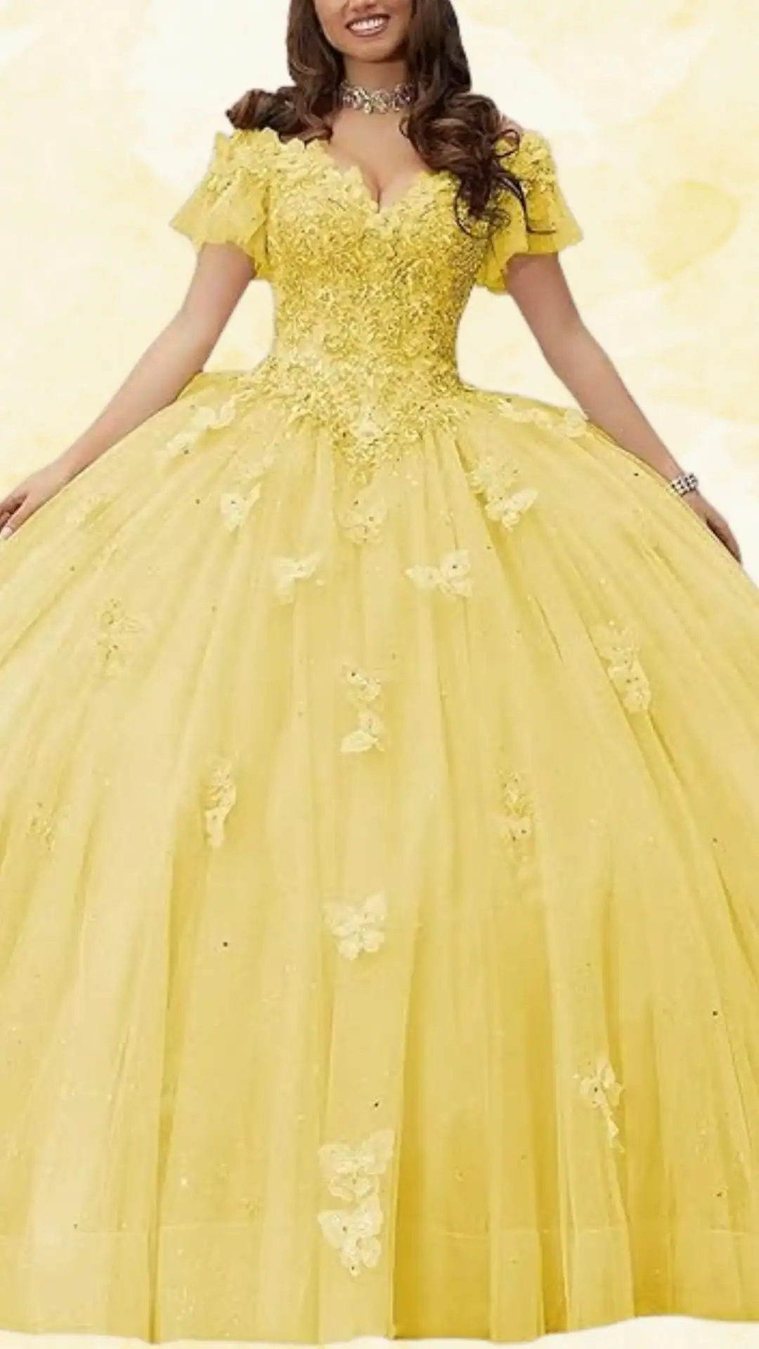 The soft, sunny yellow hue, paired with shimmering detailing, creates an ethereal and romantic aesthetic, perfect for a memorable quinceañera celebration.