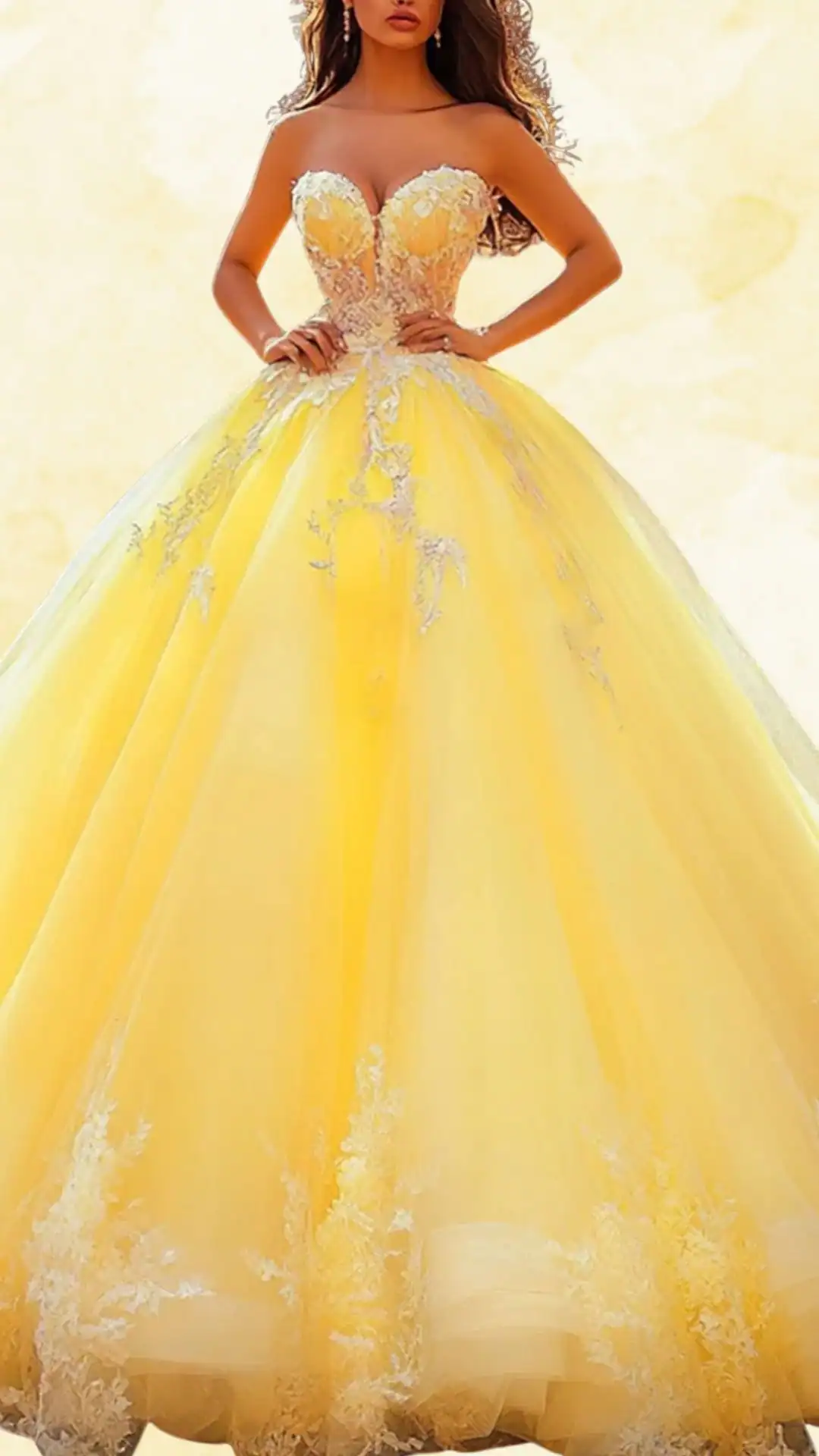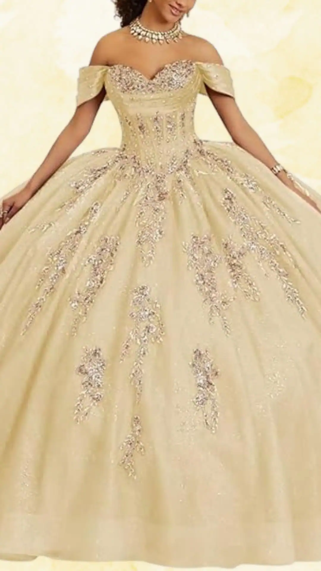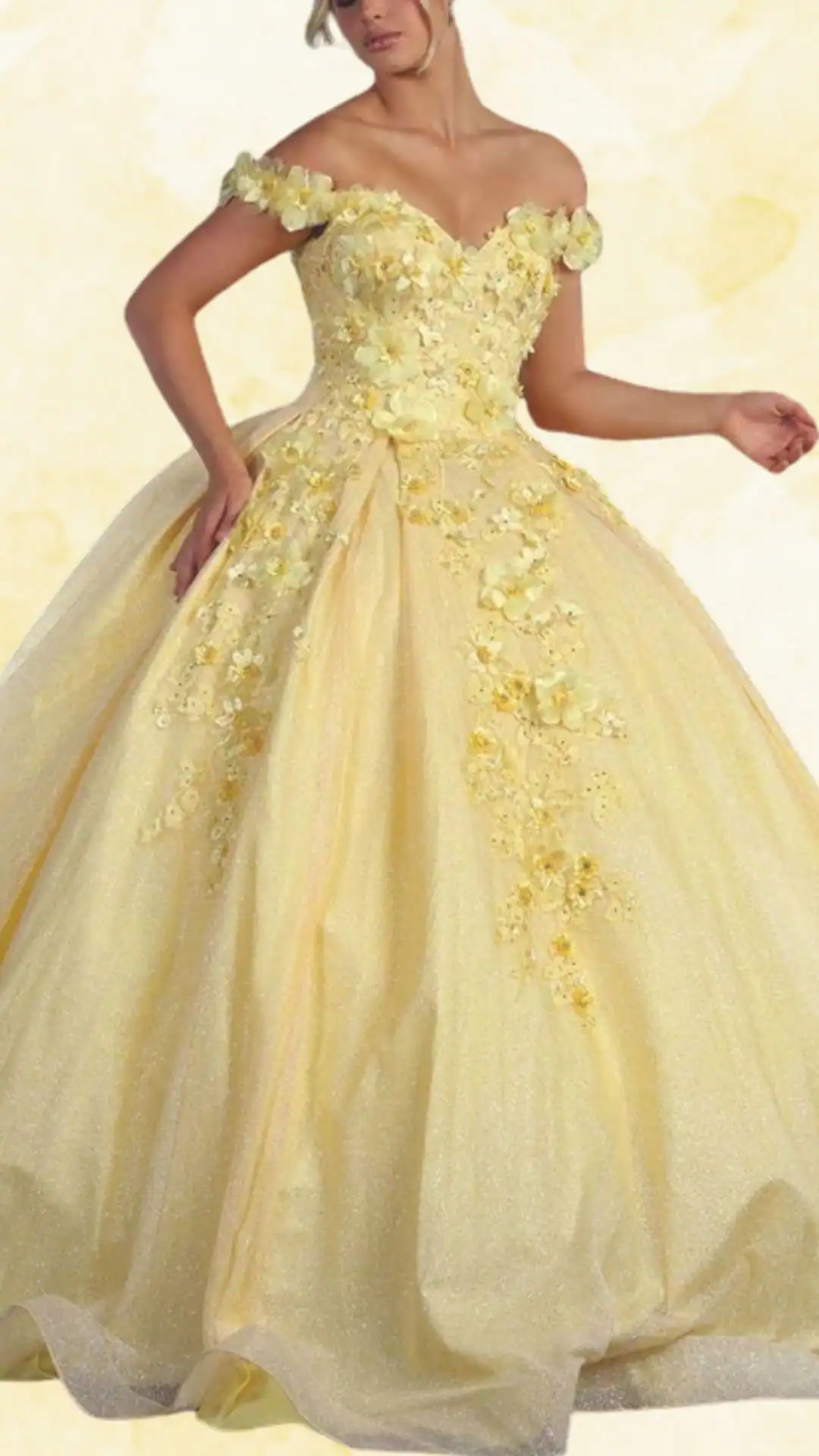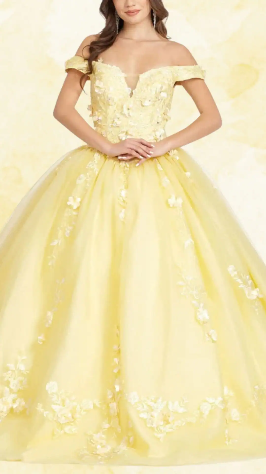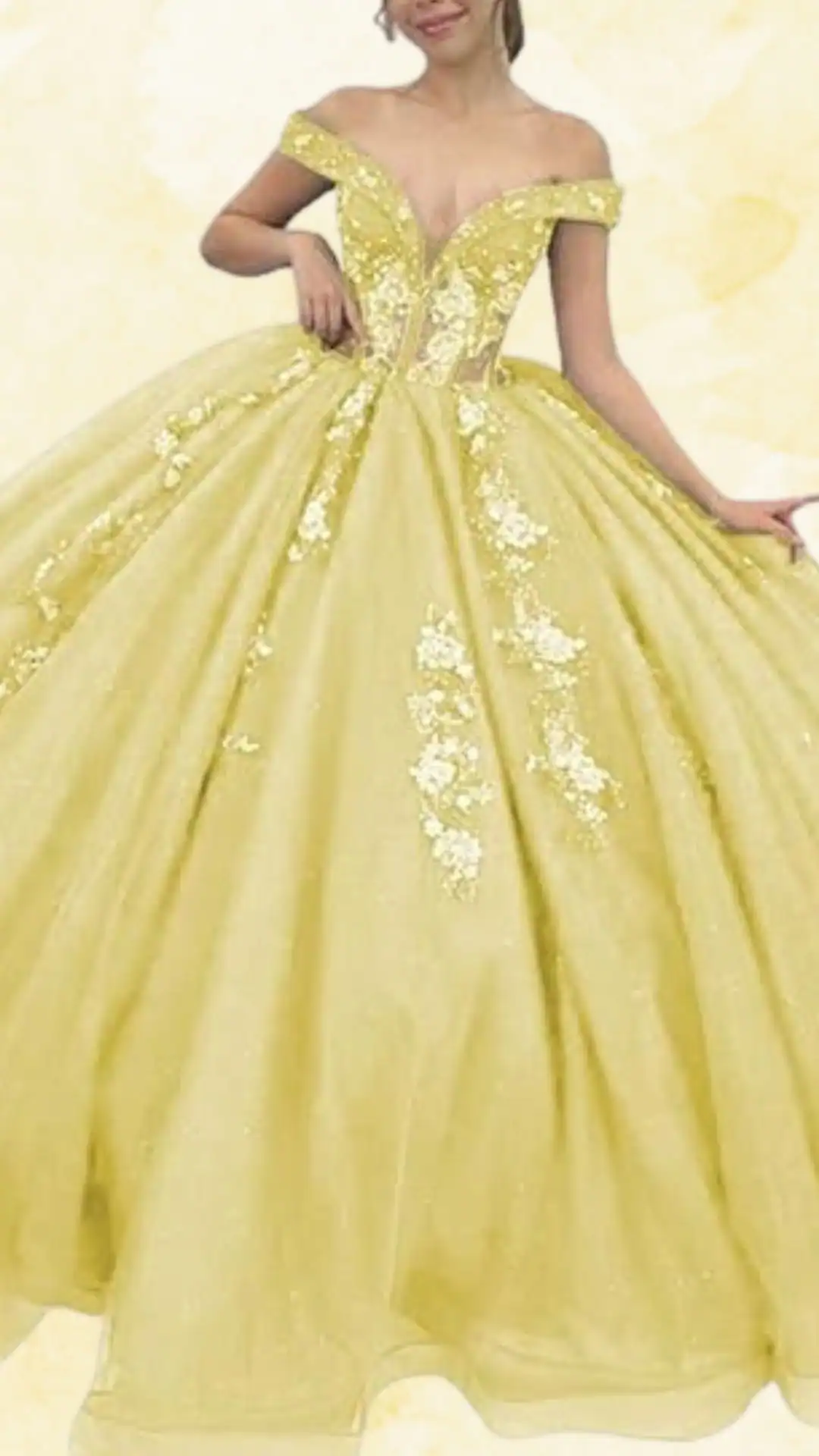 This stunning yellow Quinceañera dress embodies elegance and charm, perfect for a memorable celebration. Featuring a strapless sweetheart neckline paired with delicate off-shoulder sleeves, it creates a beautiful frame for the shoulders and collarbone.