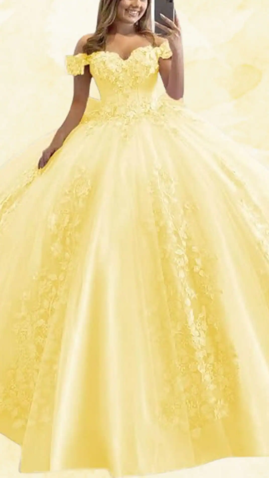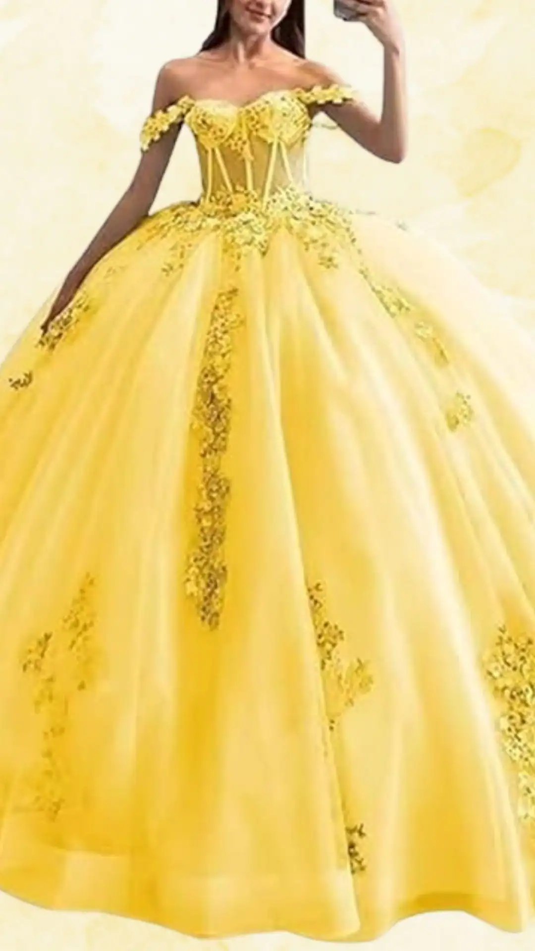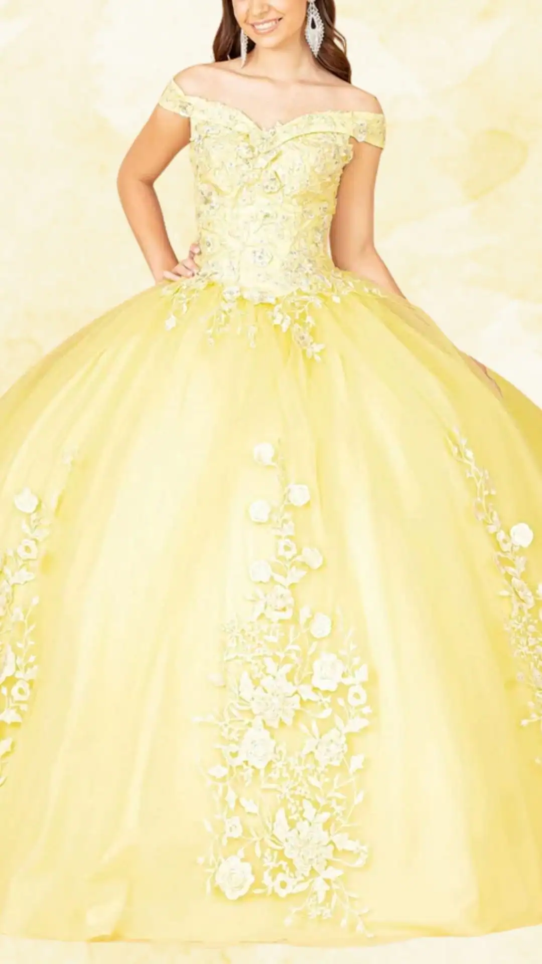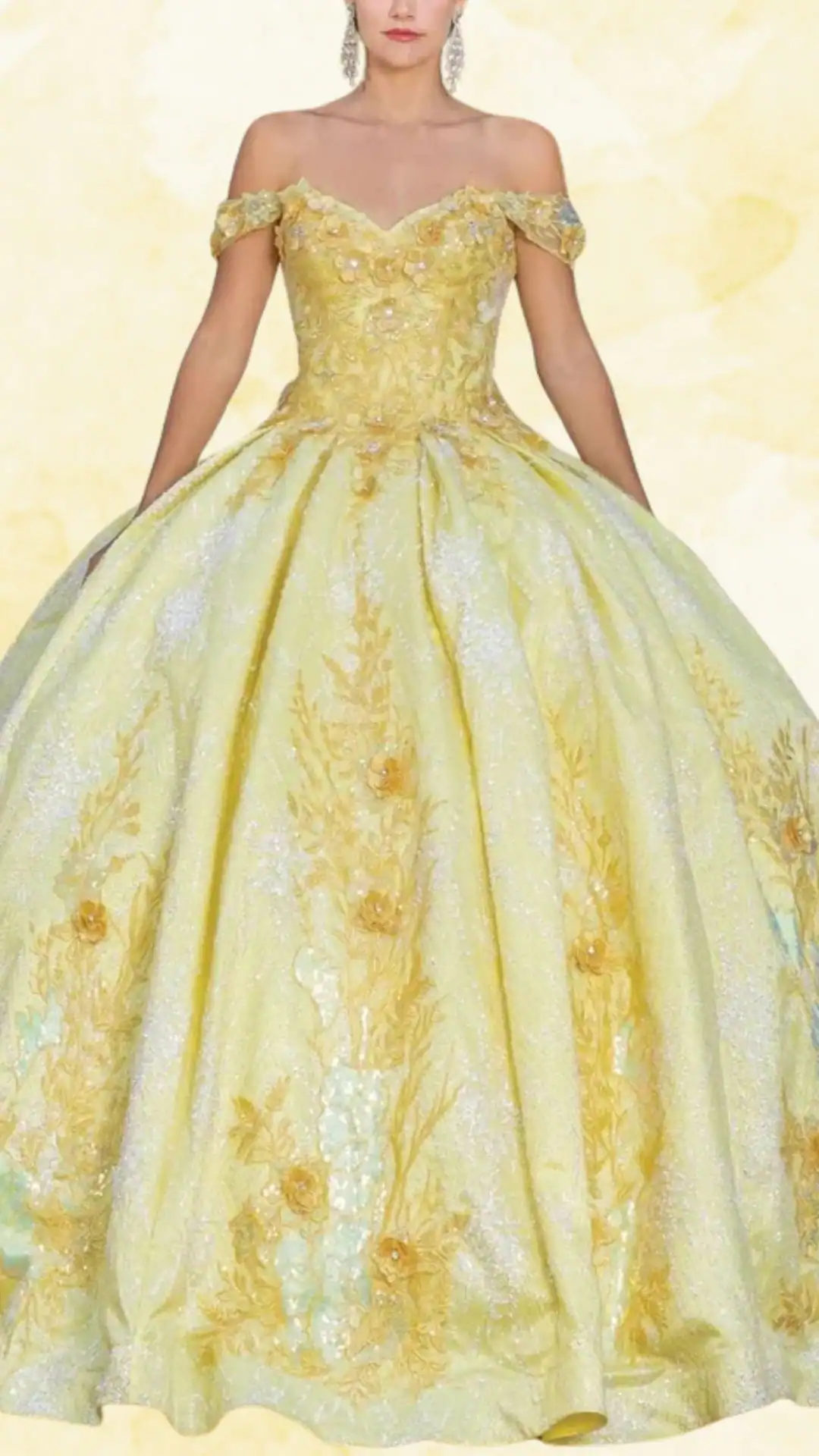 This breathtaking yellow quinceañera dress is a showstopper, featuring a striking sweetheart neckline and elegant off-the-shoulder sleeves, which enhance the romantic vibe. The voluminous ball gown silhouette offers a perfect blend of dramatic flair and timeless elegance.