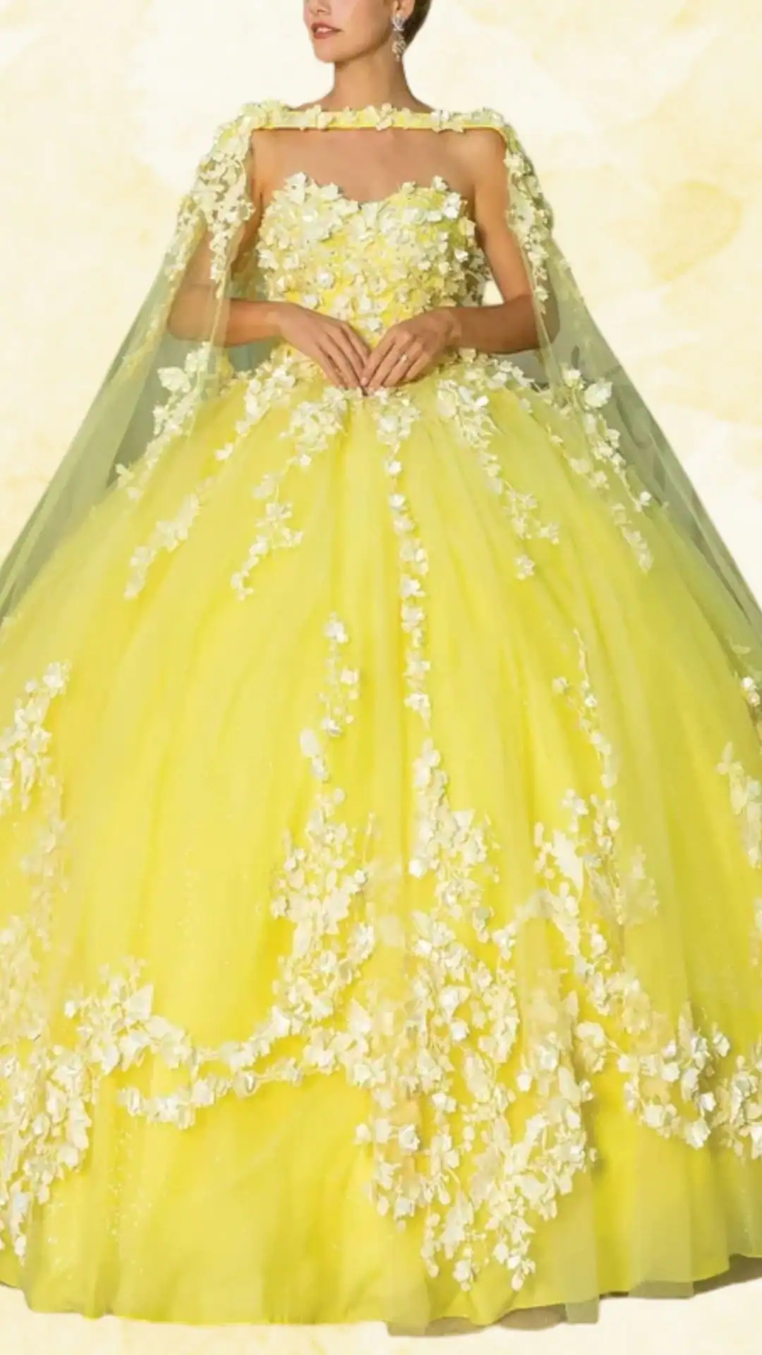 The voluminous skirt cascades gracefully to the floor, adorned with stunning white floral appliqués that beautifully contrast with the vibrant yellow fabric.