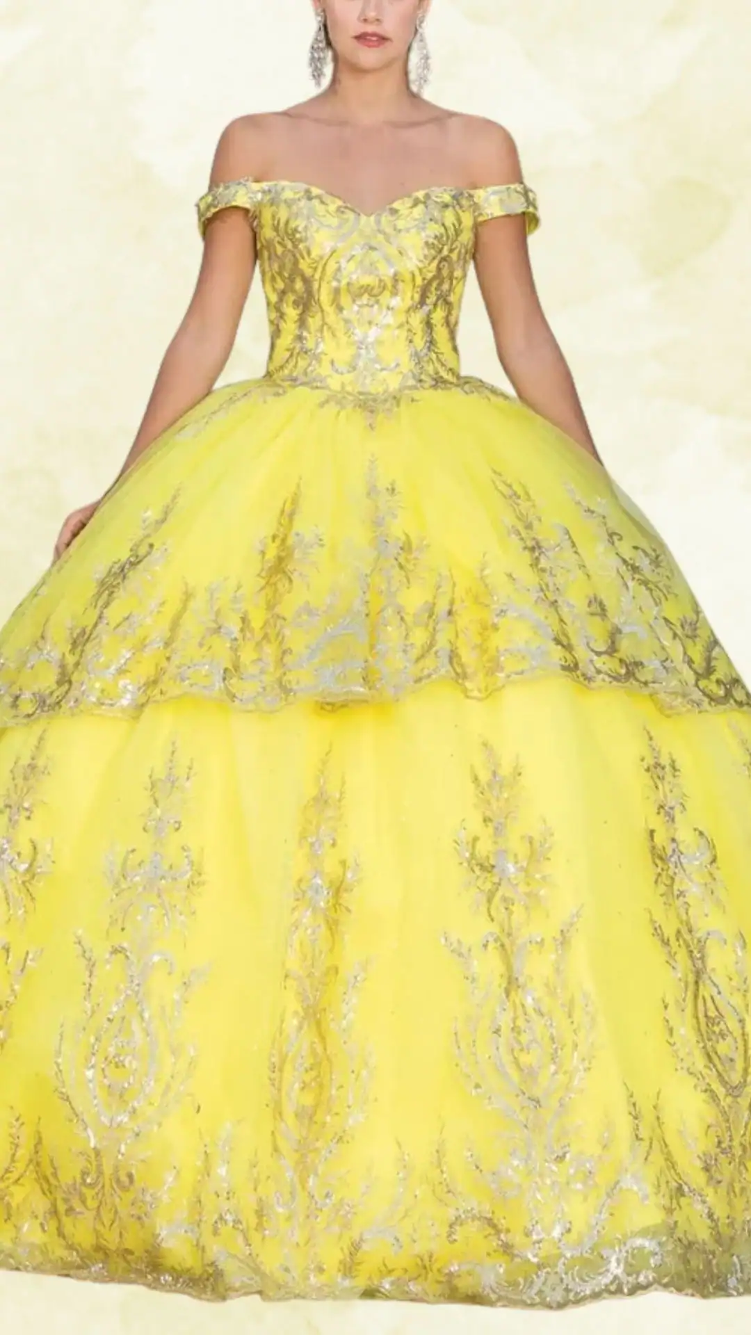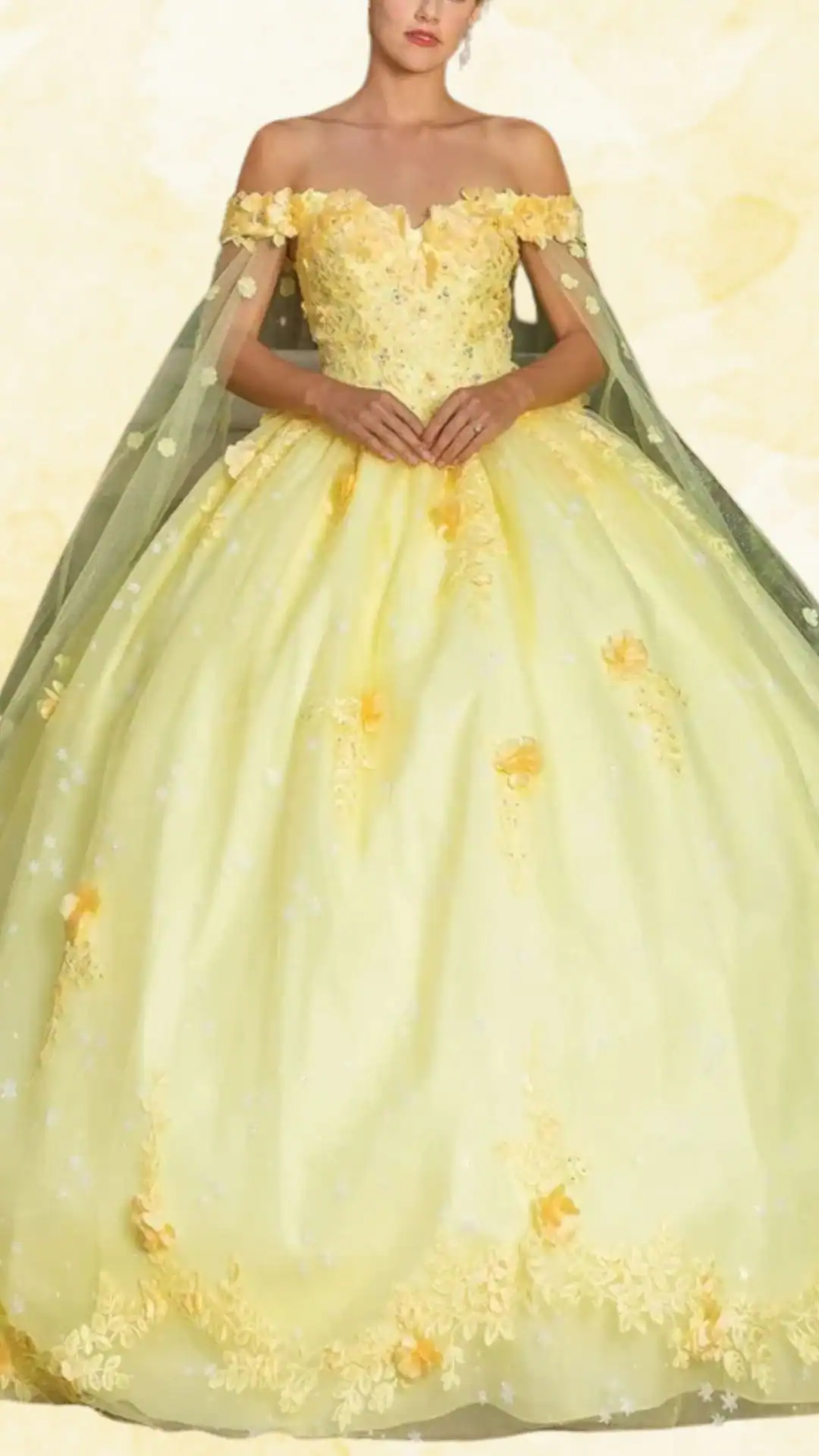 This stunning yellow quinceañera dress showcases a dreamy off-the-shoulder neckline and whimsical ruffled sleeves.