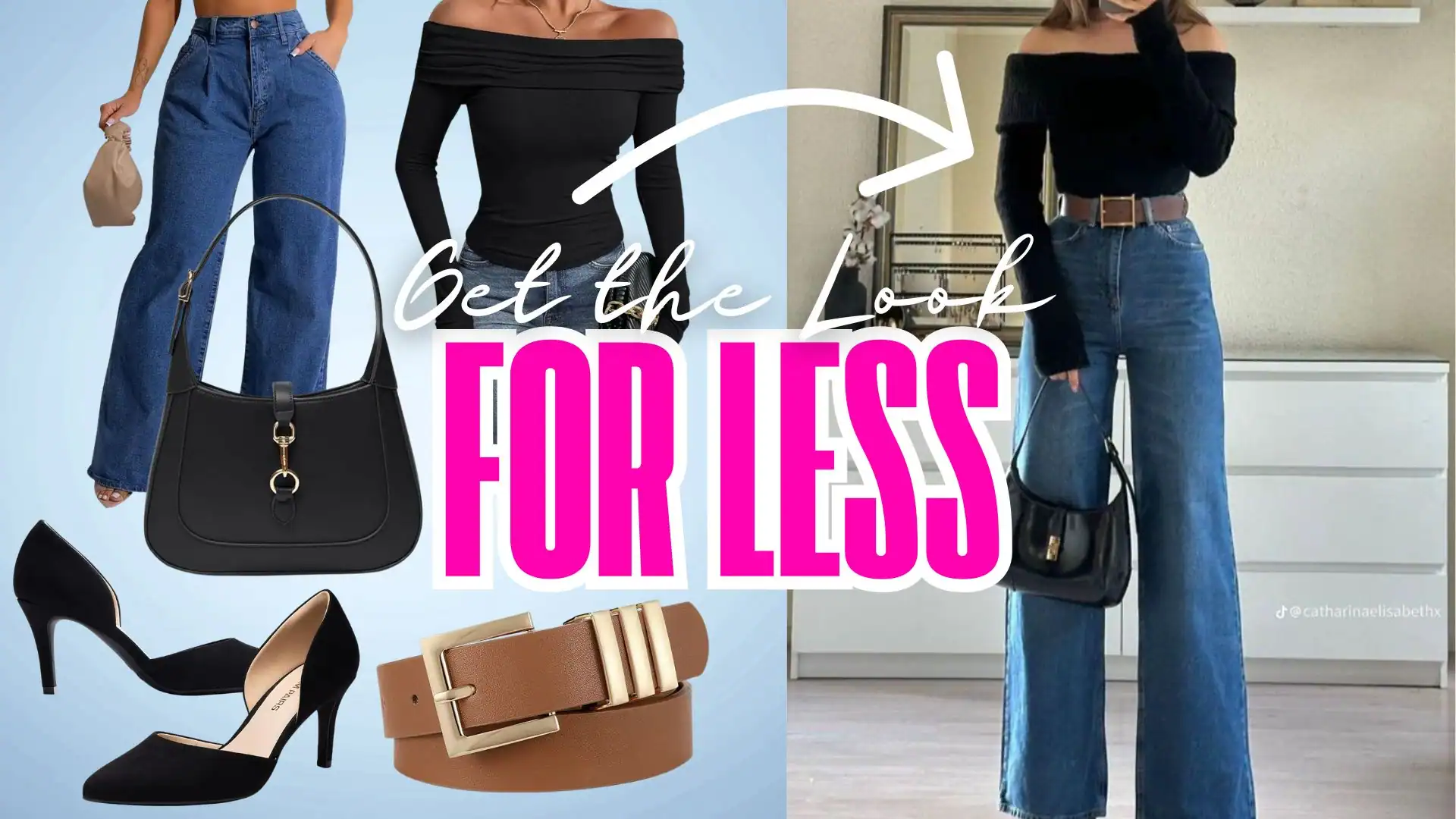 This amazon outfit is all about quiet confidence: a chic off-the-shoulder black sweater, high-waisted wide-leg denim, a bold statement leather belt, sleek black pumps, and a timeless designer dupe—a classic black Gucci Jackie-inspired handbag that pulls the whole look together.