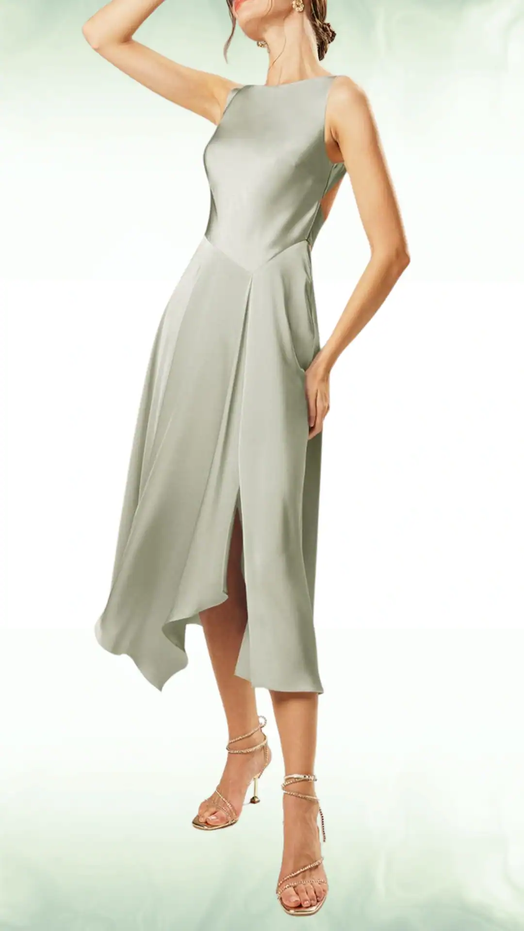 This sage green dress features a sleek, satin-like fabric with a smooth, glossy texture, showcasing a subtle drape and elegant twist detail at the waist that flatters the figure. With a classy knee-length design and a thigh-high slit, it exudes sophistication, making it perfect for a formal fall wedding or special occasion, appealing to teenage girls seeking a chic and trendy look.