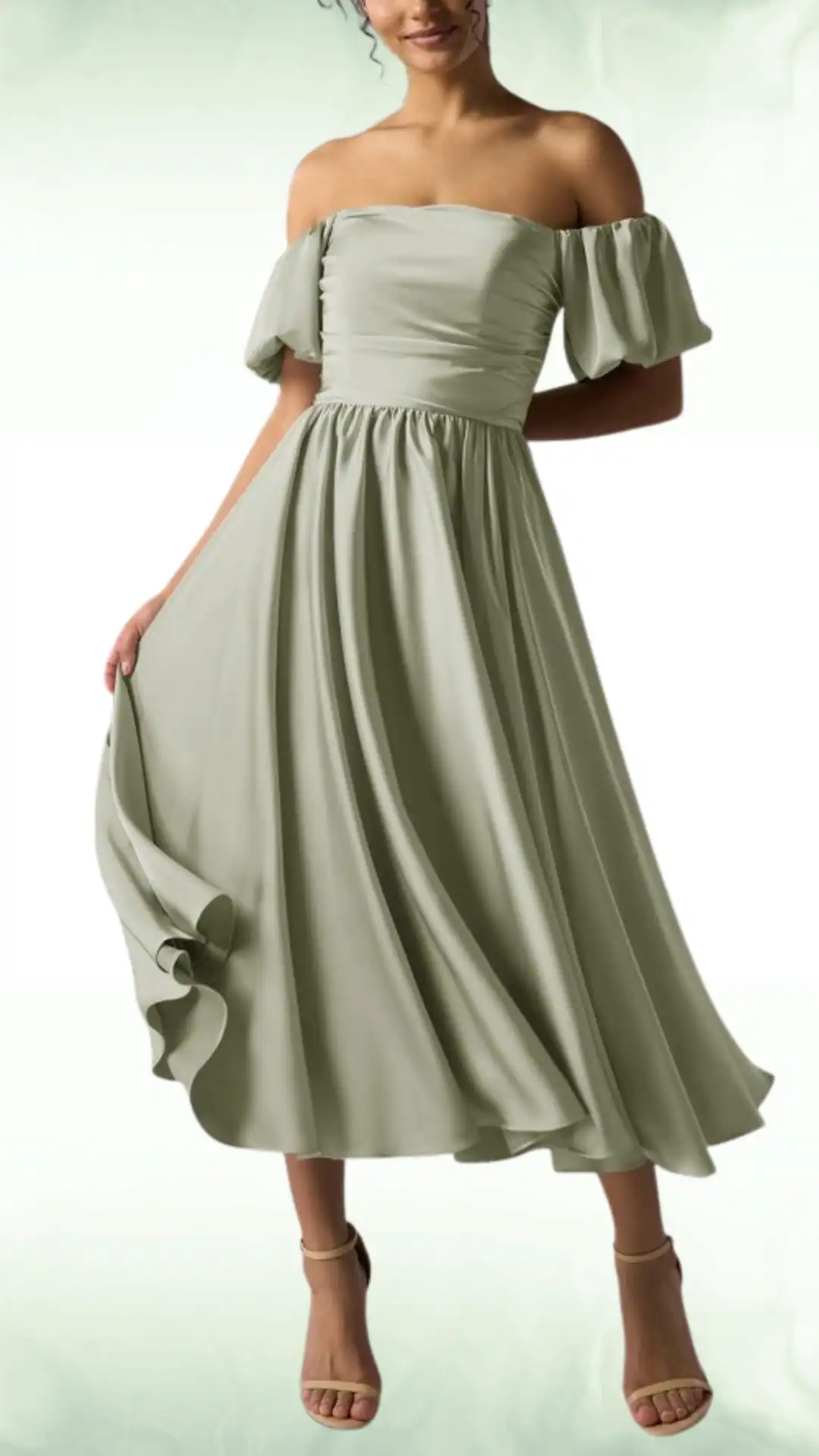 Off Shoulder Puff Sleeve Green Fall Wedding Guest Dress
