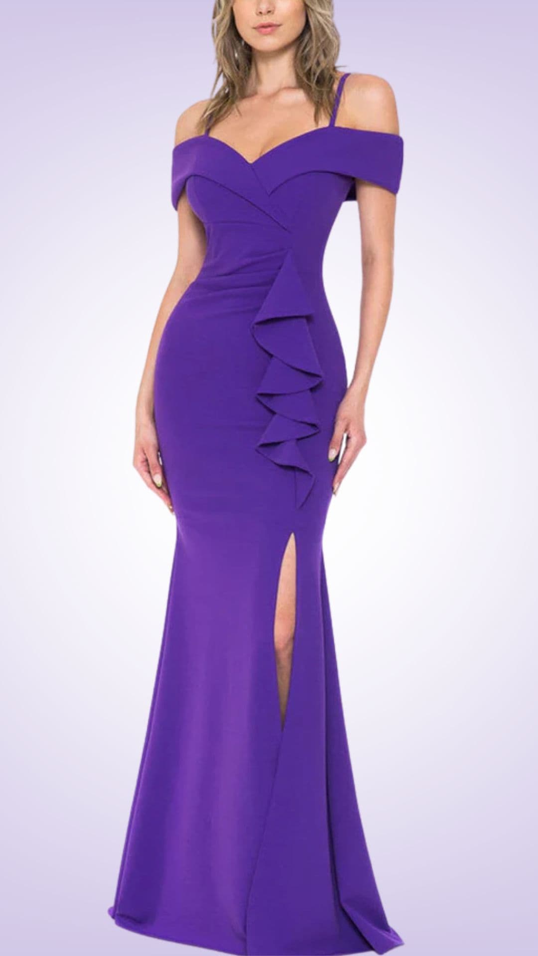 Crafted from smooth, slightly stretchy fabric, this gown features a universally flattering silhouette with a sweetheart neckline, off-the-shoulder fold-over detail, and a cascading side ruffle for a touch of movement.