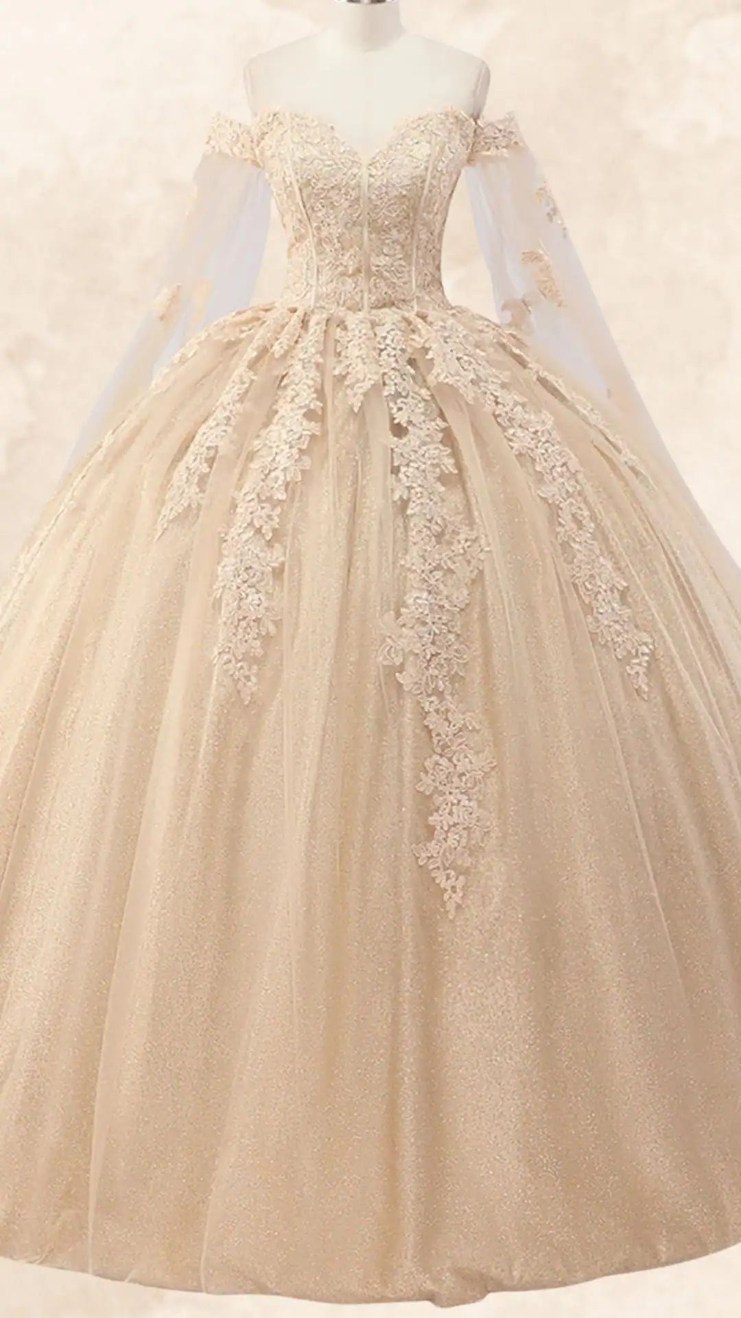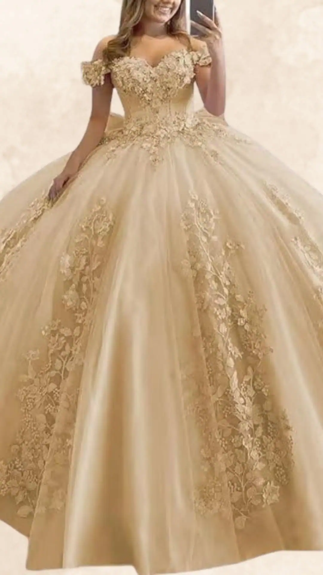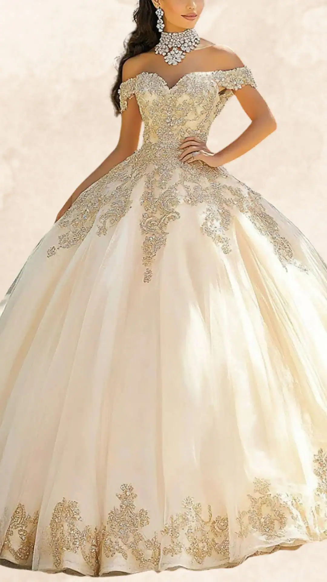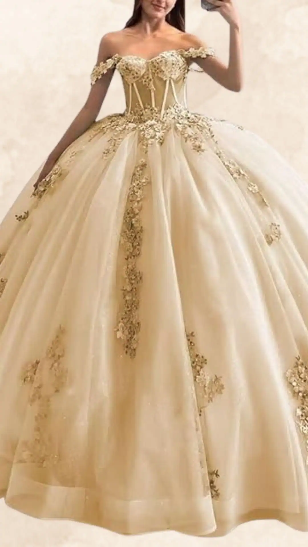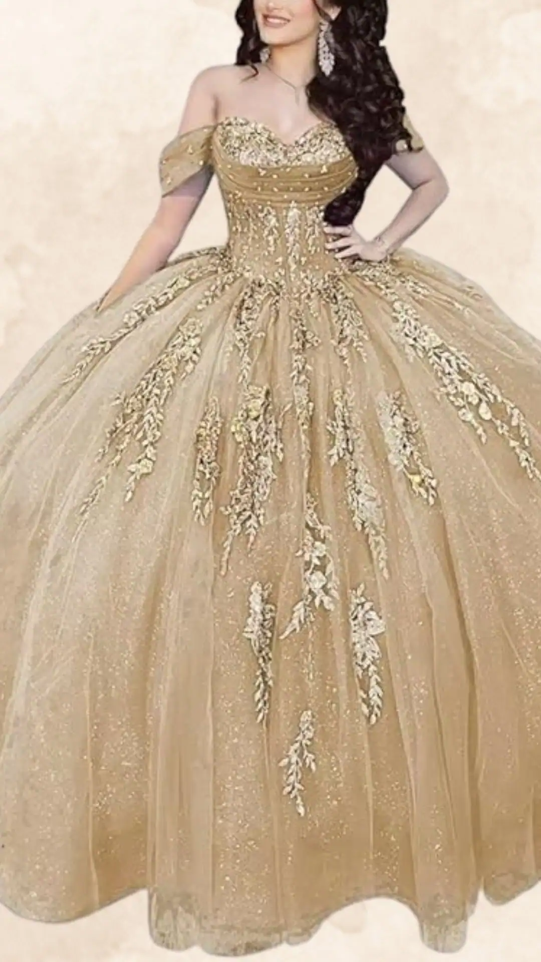 Elegant Off-the-Shoulder Gold Quinceañera Dress with Lace Appliqué