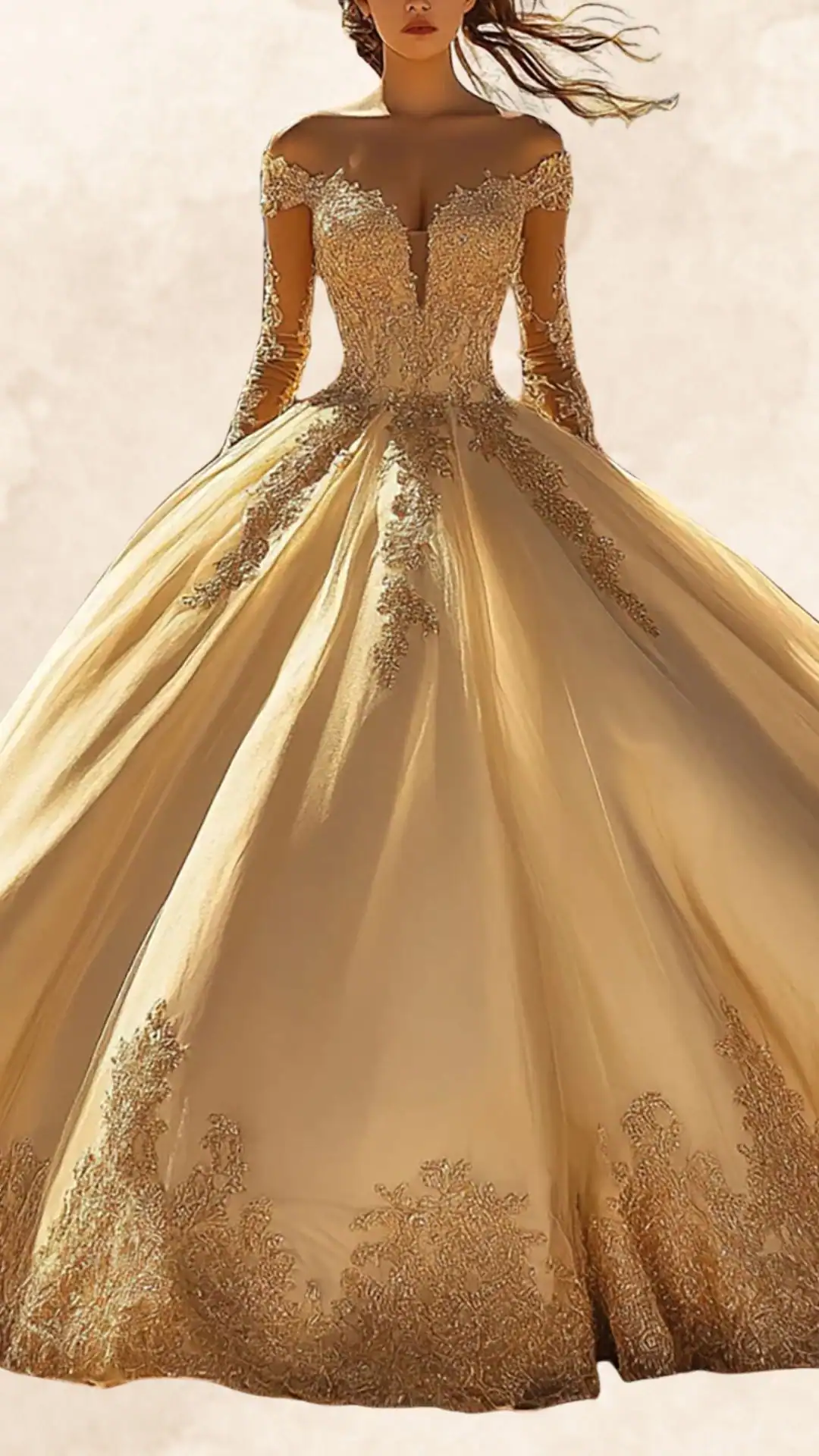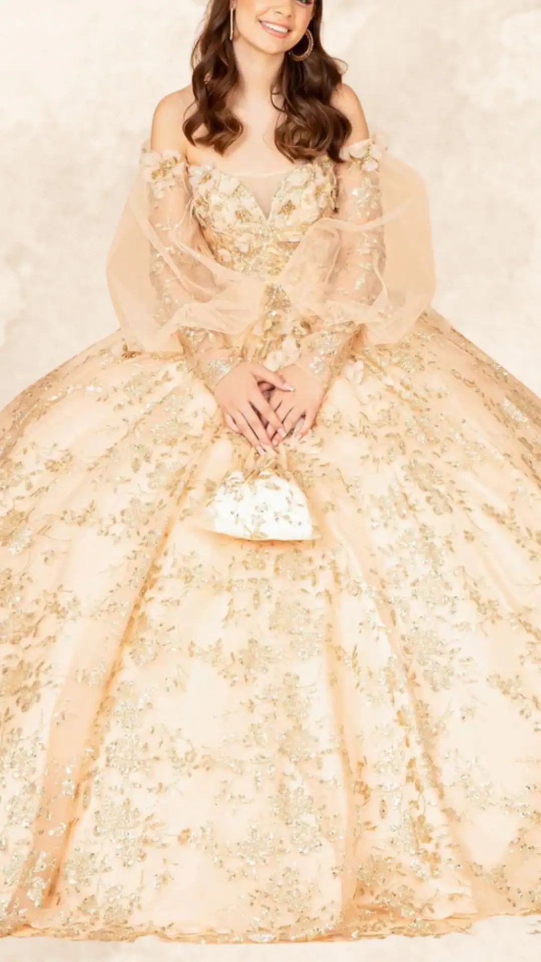 Gold Quinceañera Dress with Floral Embroidery and Sheer Sleeves