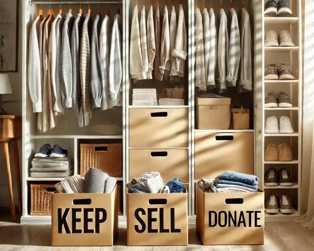 Categorize and assess: Divide your wardrobe into categories, such as tops, bottoms, dresses, outerwear, and accessories. Examine each piece and sort them into what you wear regularly and what you don’t, then divide the pieces again into what’s in good condition and what no longer suits needs.
